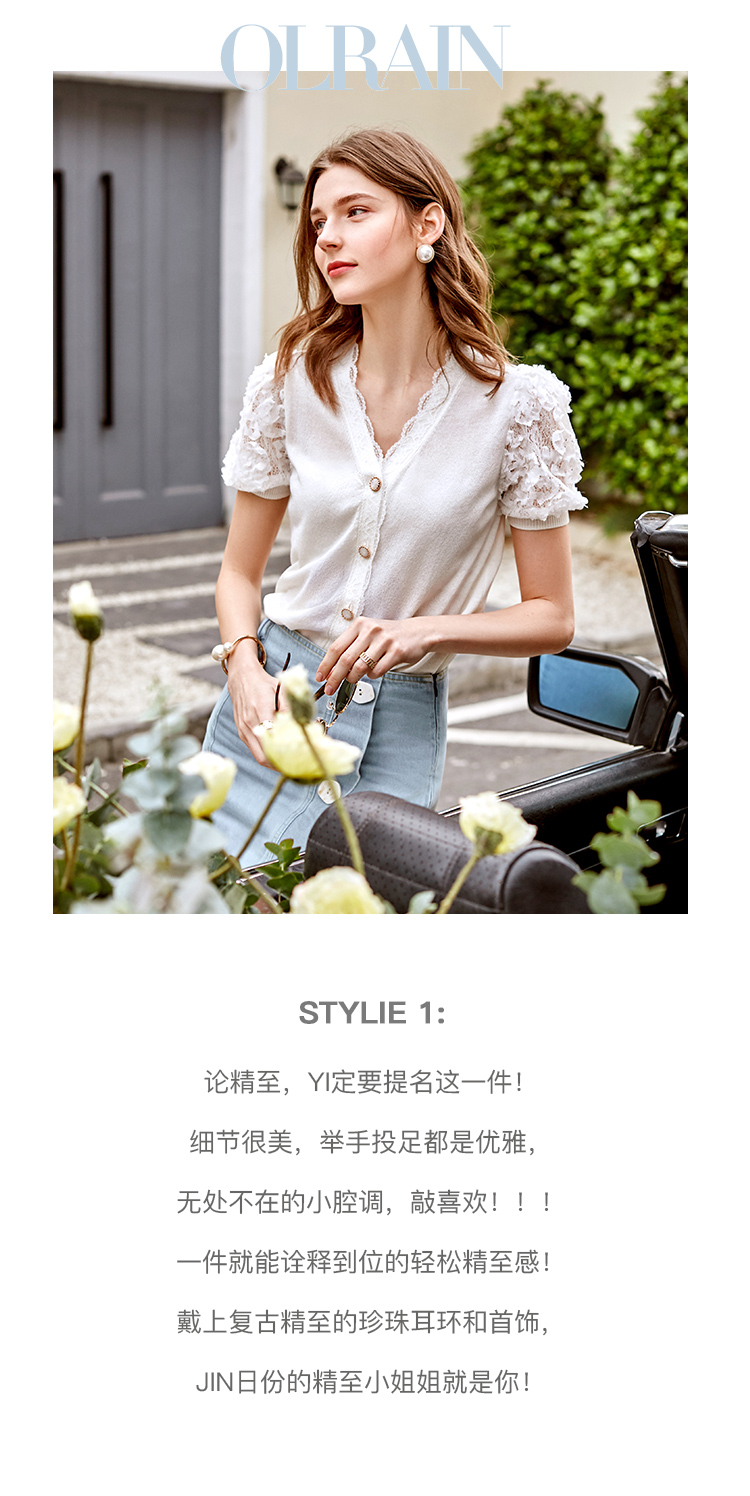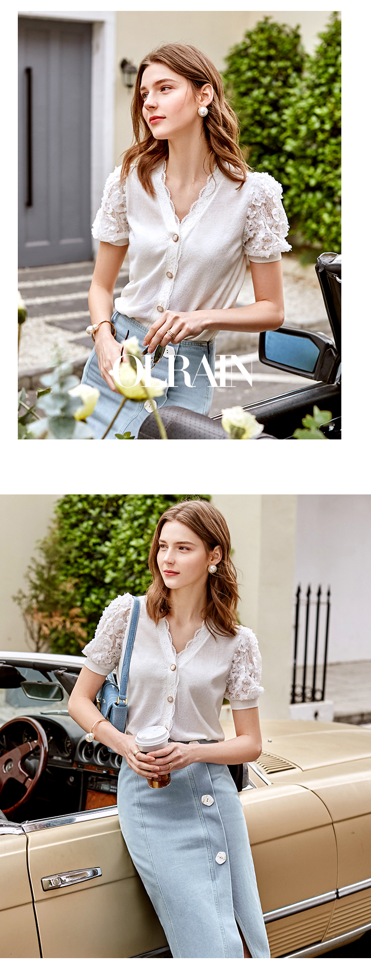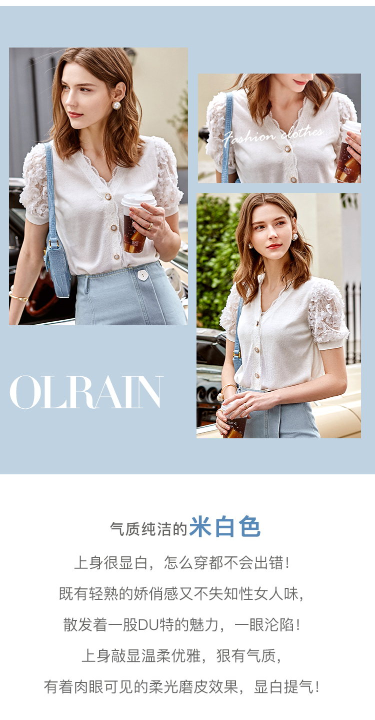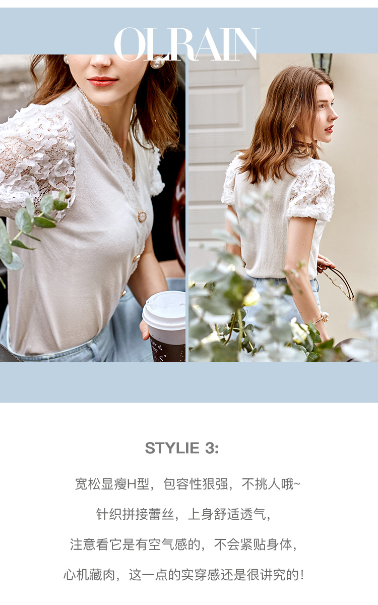 欧芮儿白色毛针织衫女2021新款拼接蕾丝袖气质年轻俏皮法式上衣