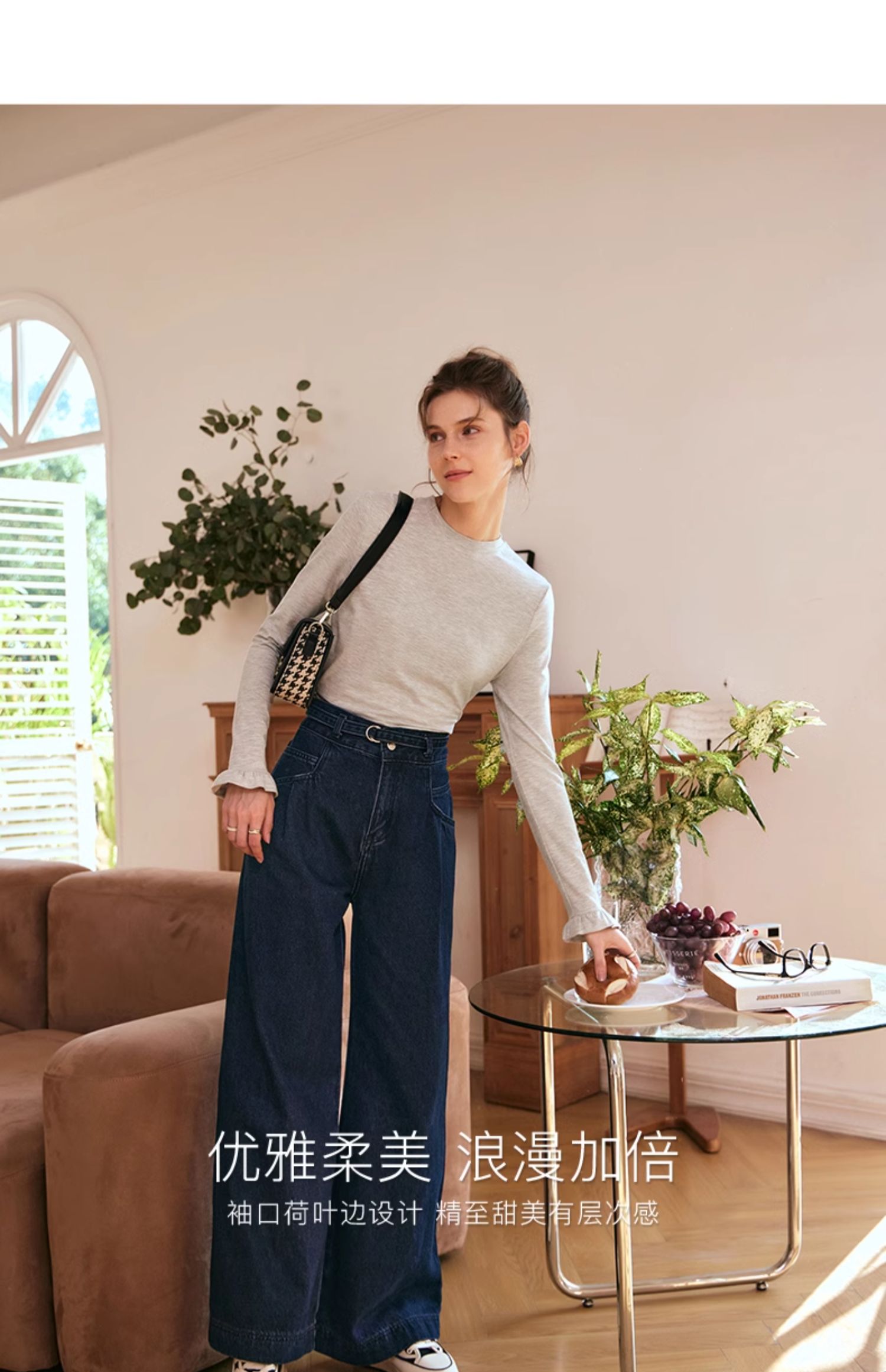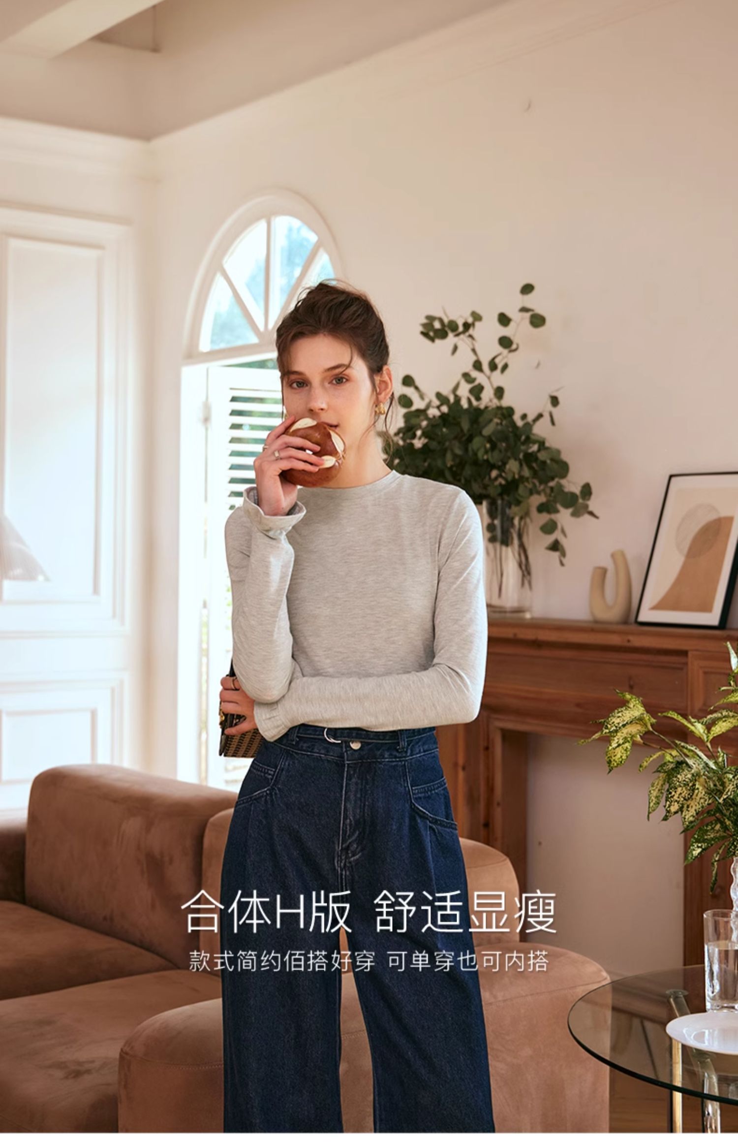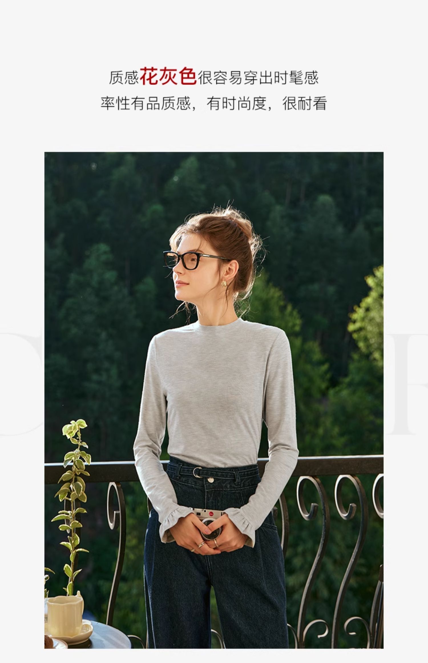 OLrain欧芮儿花灰色长袖T恤女早春2024年新款气质百搭打底衫