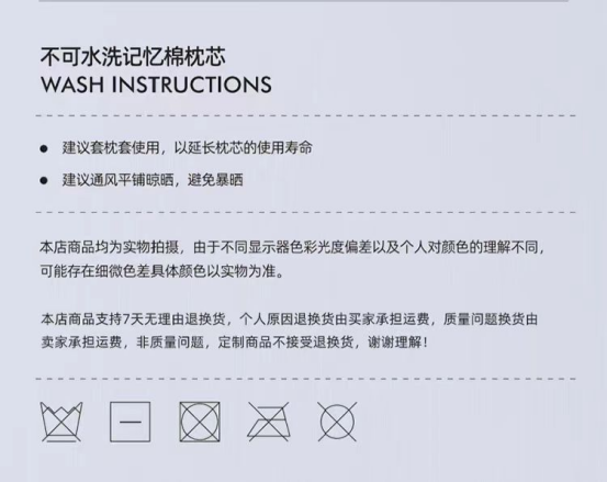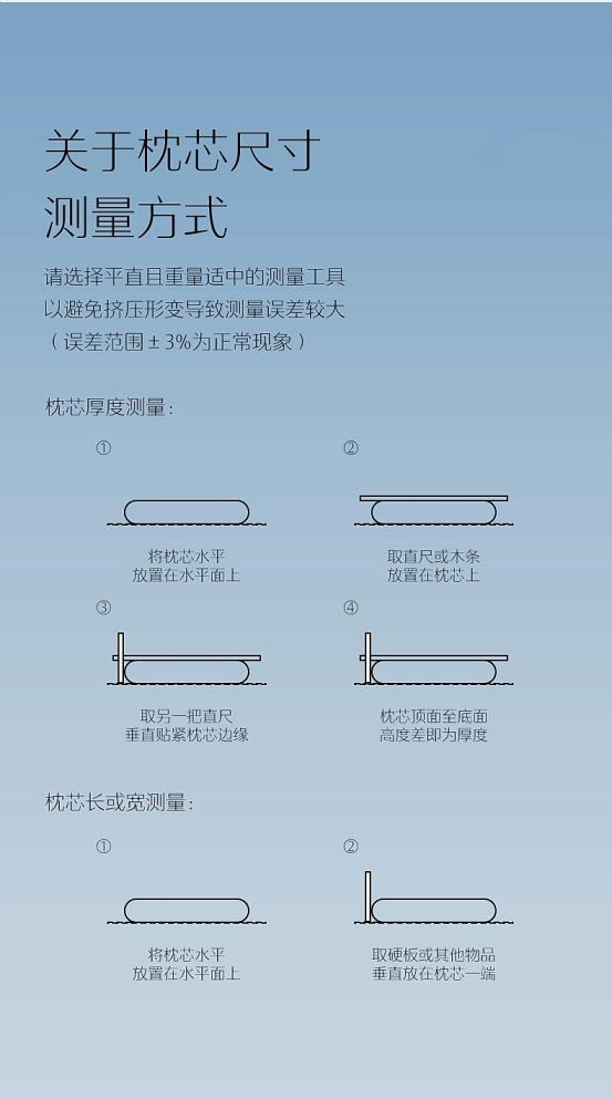 洗涤方式:记忆枕不可水洗,不可暴晒 平时保养建议:套枕套使用,以延长枕芯寿命 枕芯测量方式如下图(测量时避免挤压导致测量误差较大)