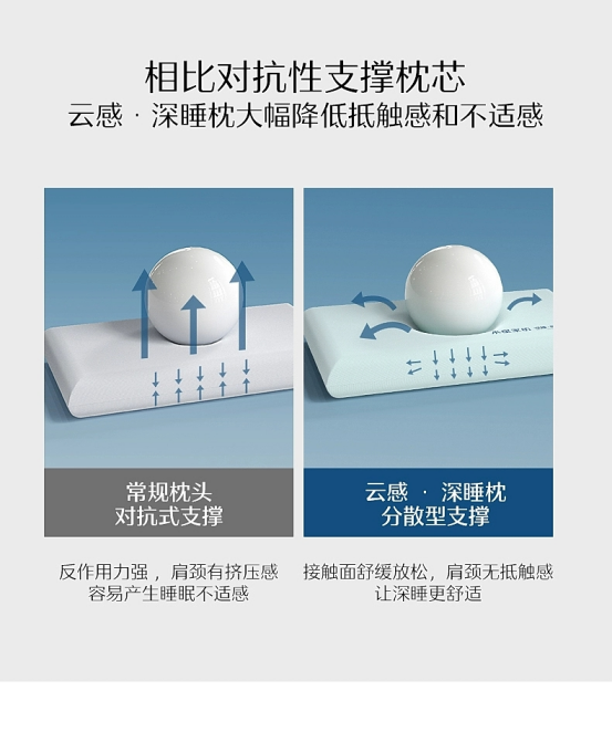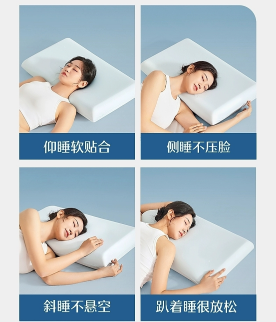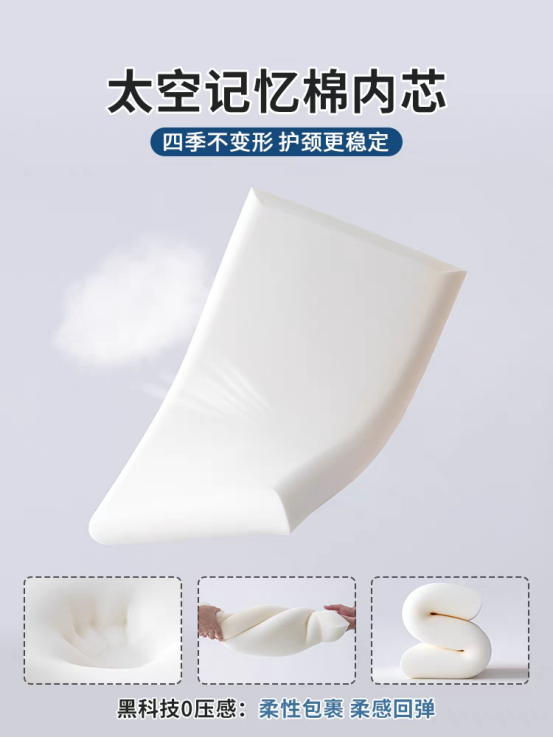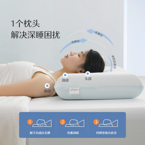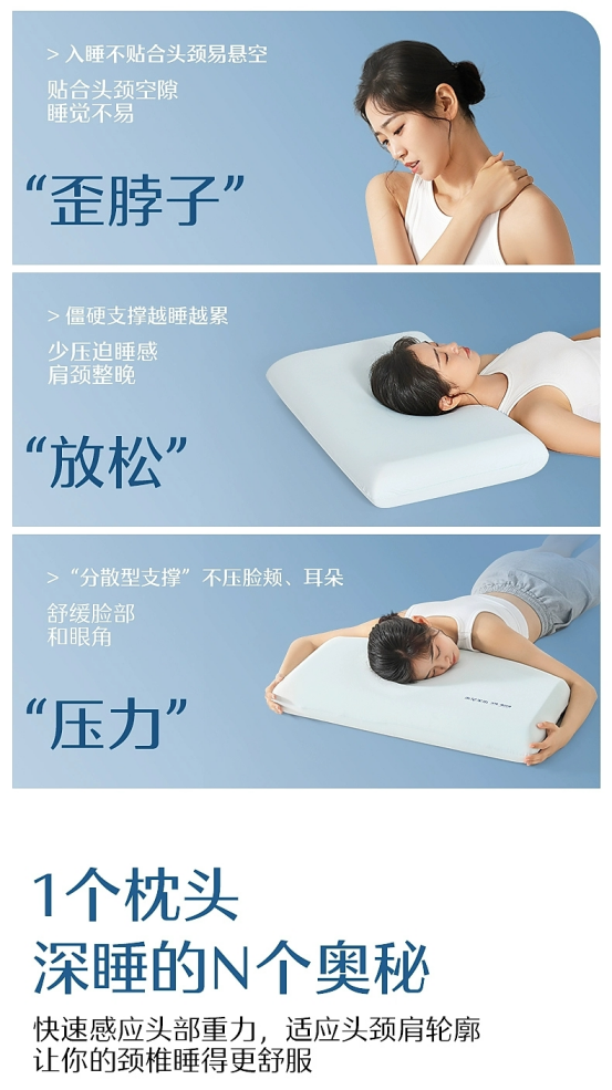 慢回弹零压力 远离颈椎悬空压迫 6S慢回弹 入睡贴合头颈孔隙 睡觉不易歪脖子 柔软支撑 少压迫睡感 肩颈整晚放松 分散力支撑 不压脸颊 耳朵 舒缓脸部和眼角压力