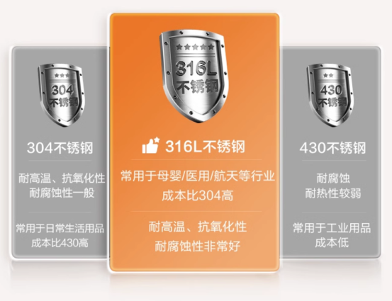 🌸316L航天级抗菌不锈钢 304食品级级不锈钢 一般的耐腐蚀、耐热性 广泛用于普通的炊具、器具等行业 我们选择的是316L不锈钢材质 一口锅为什么要用316L不锈钢❓ 而且316成本远高于SUS304 因为316L具有极高的耐磨抗腐蚀性 常用于母婴、医疗等医疗和航天等高端行业 更重要的是,它天然具有抗菌性能 与常见的304不锈钢相比 316L不锈钢的耐腐蚀性更强 抗菌性能也更出色💪