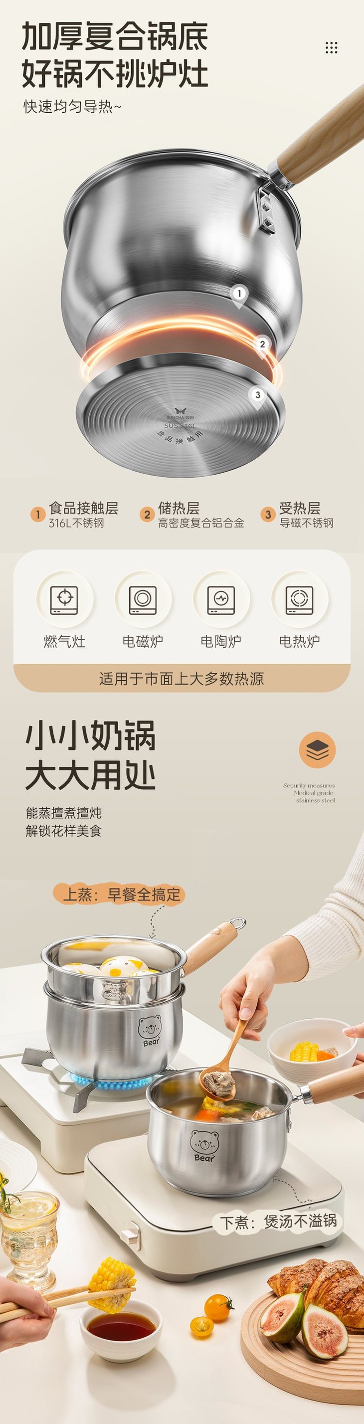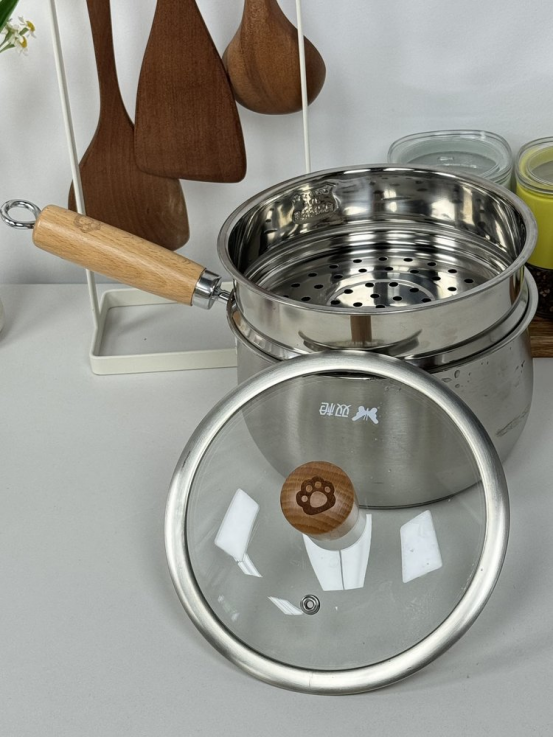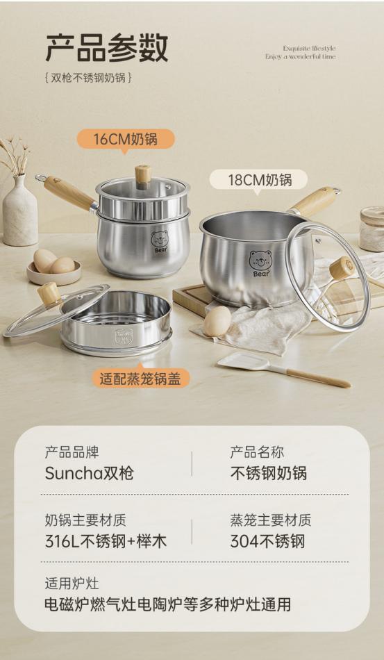 材质:奶锅:316L不锈钢+榉木,蒸笼304不锈钢