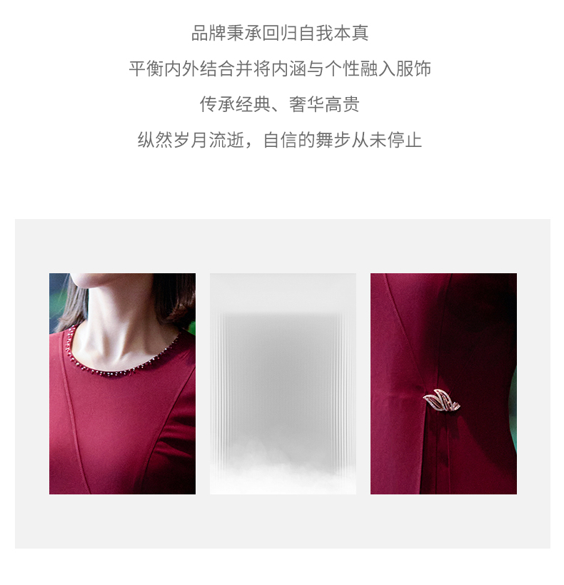 成熟、稳重、高贵典雅、大方得体 融合东方文化的含蓄和法国的浪漫 将创意的艺术性与消费需求相结合 为自信女性塑造高品质场合服装
