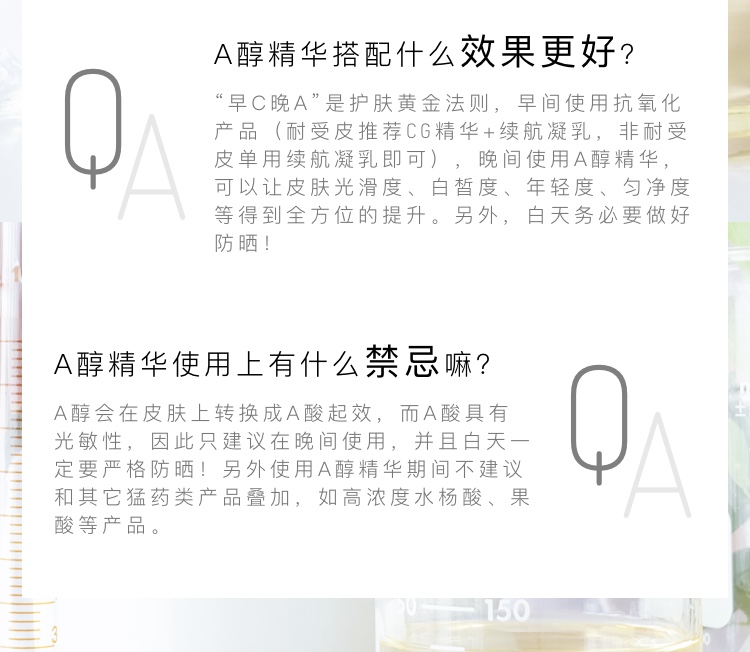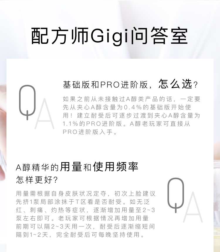 如果之前从未接触过A醇类产品的话,一定要先从夹心A醇含量为0.4%的基础版开始使用!建立耐受后可逐步过渡到夹心A醇含量为1.1%的PRO进阶版。A醇老玩家可直接从PRO进阶版入手。