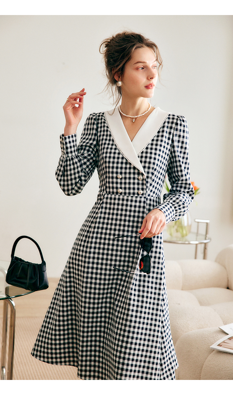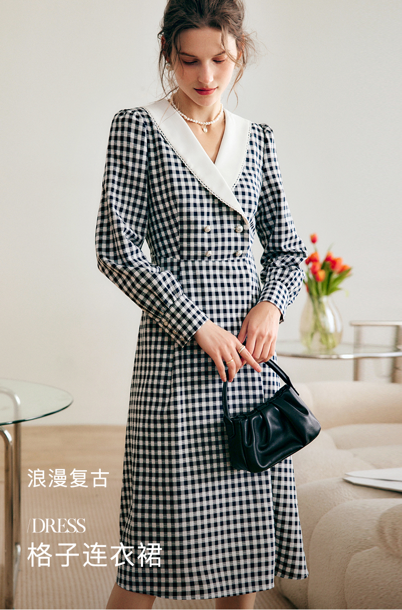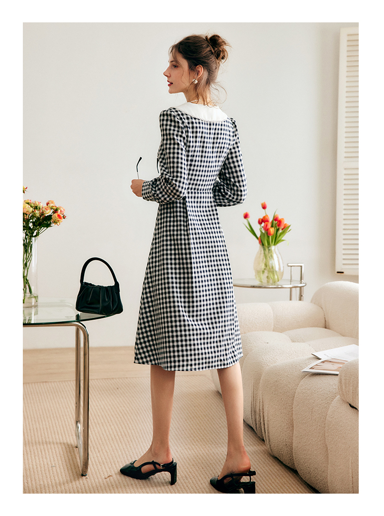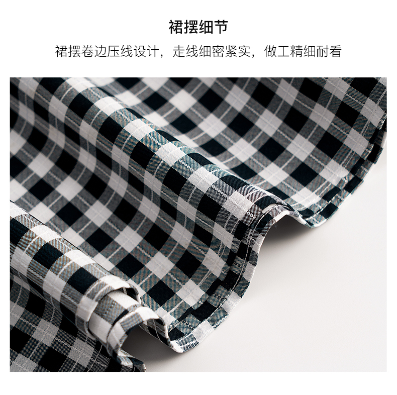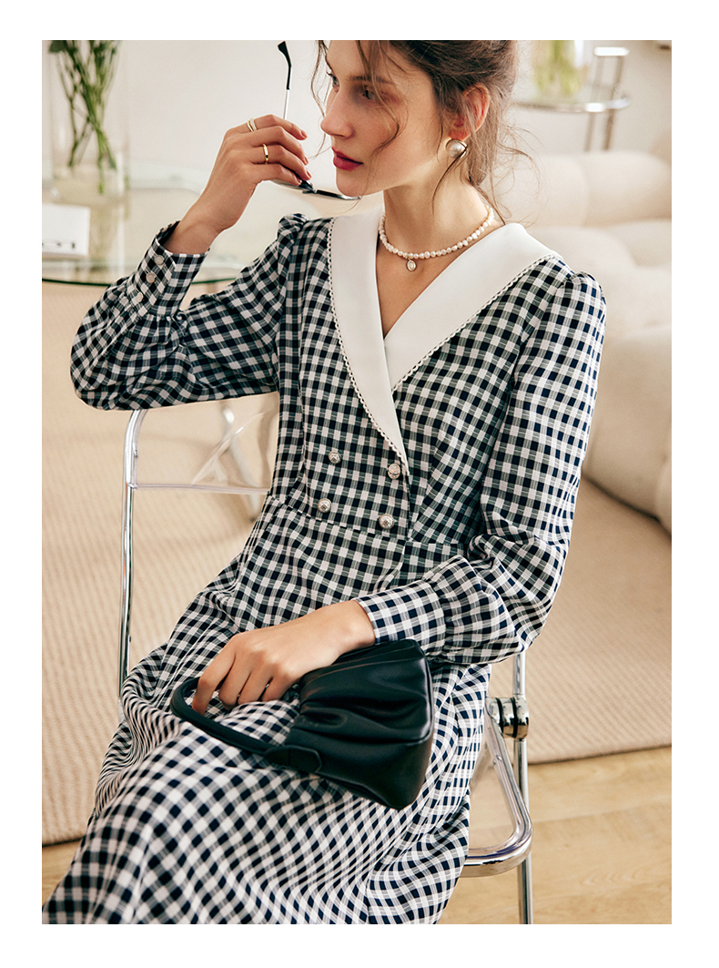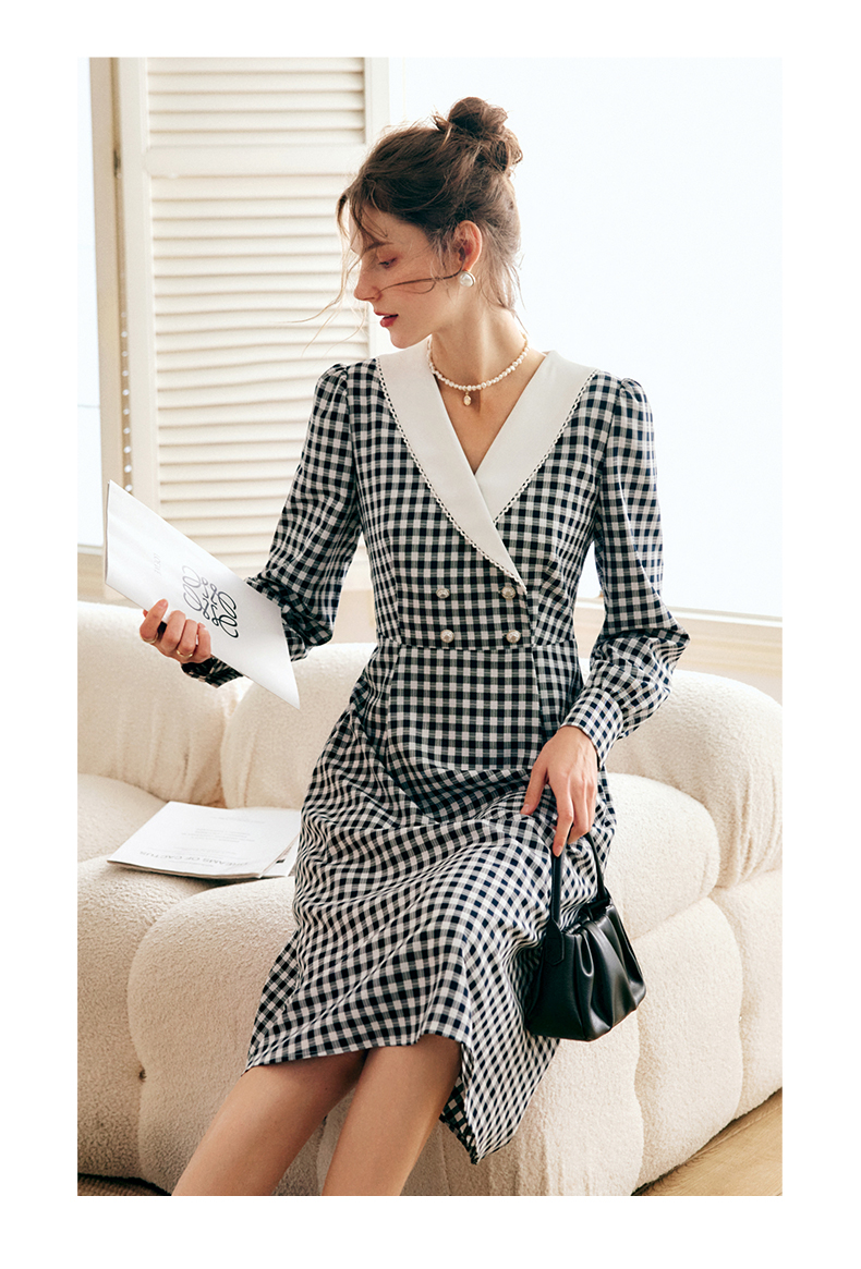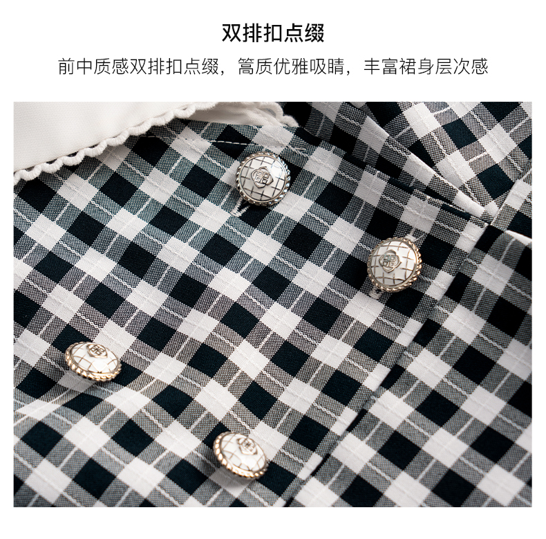 欧芮儿格子连衣裙女夏季2022年新款收腰气质复古赫本风海军领裙子