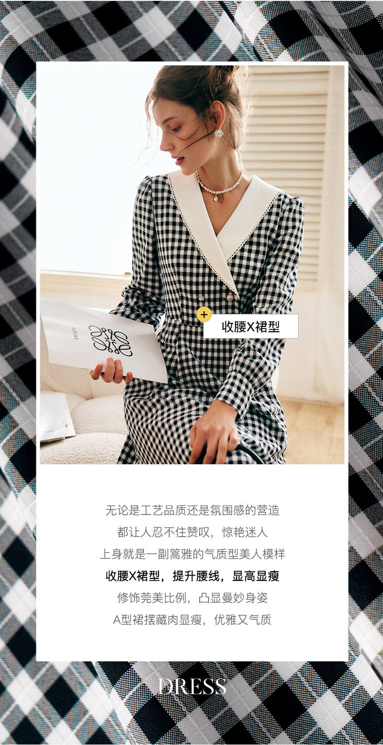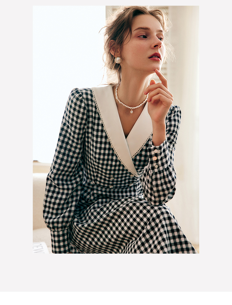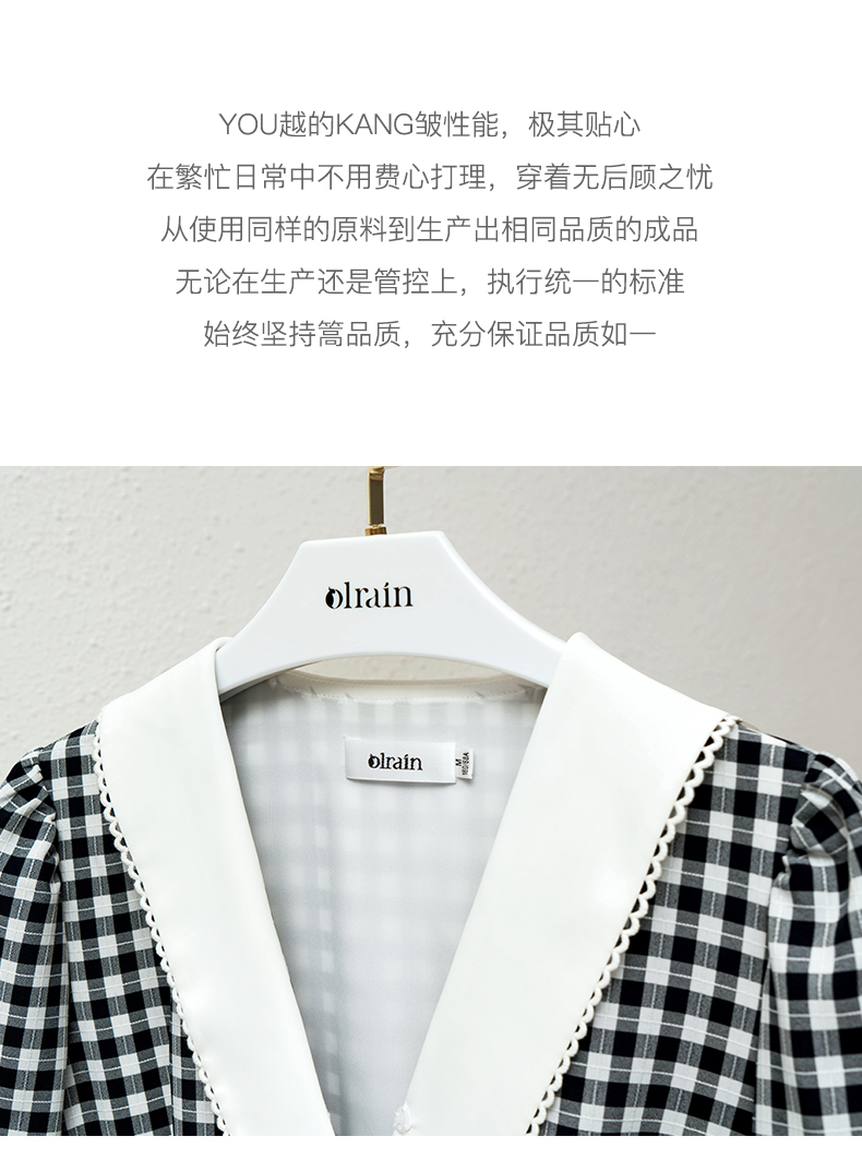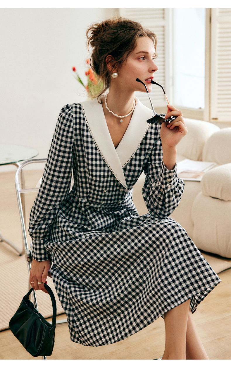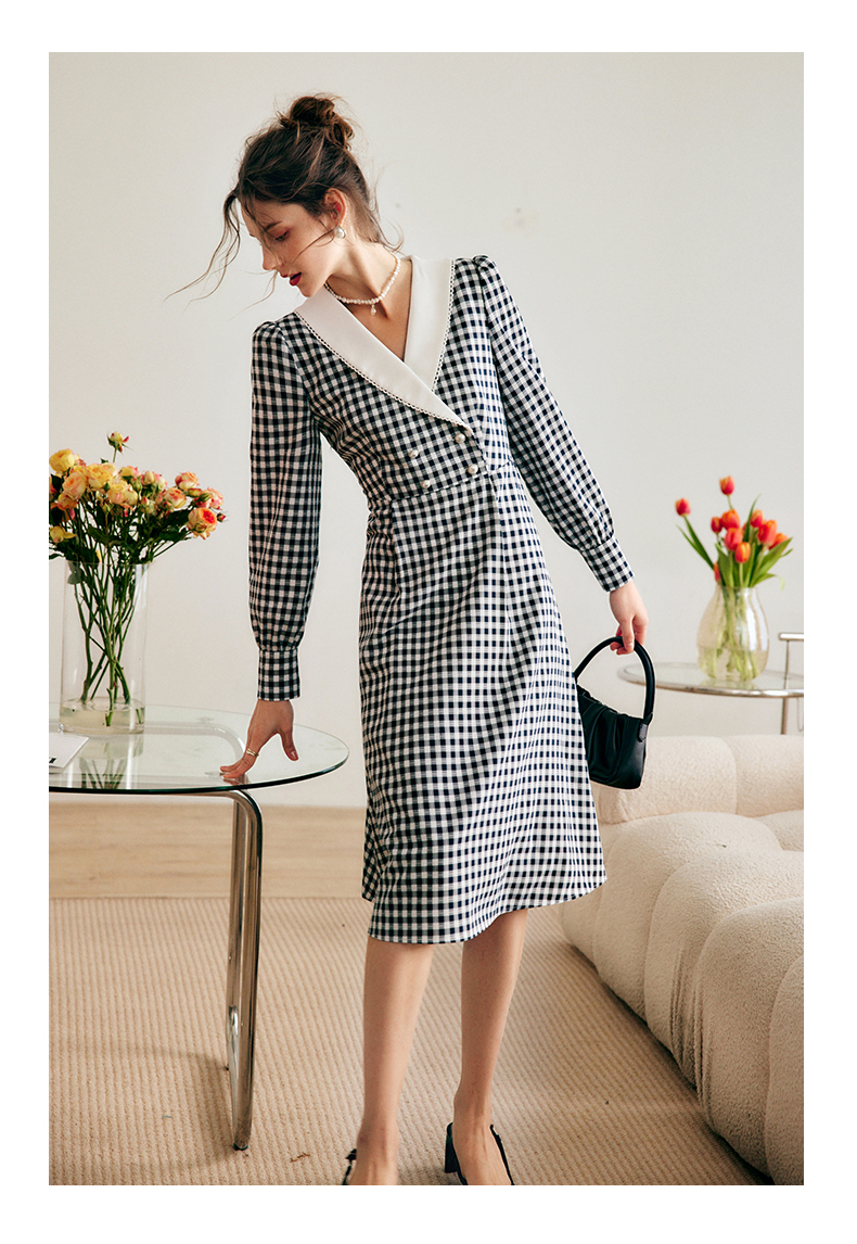 欧芮儿格子连衣裙女夏季2022年新款收腰气质复古赫本风海军领裙子
