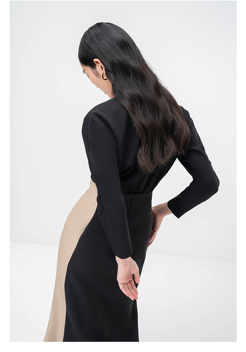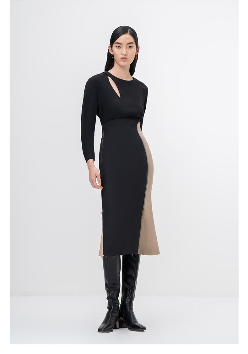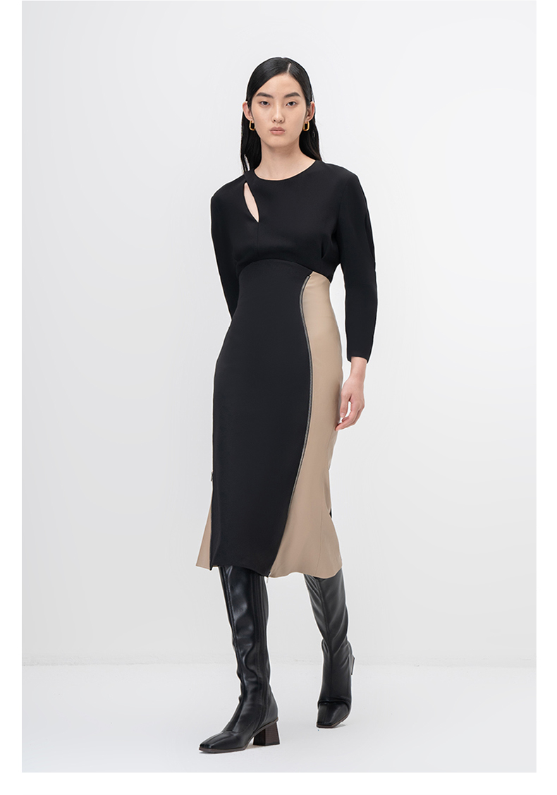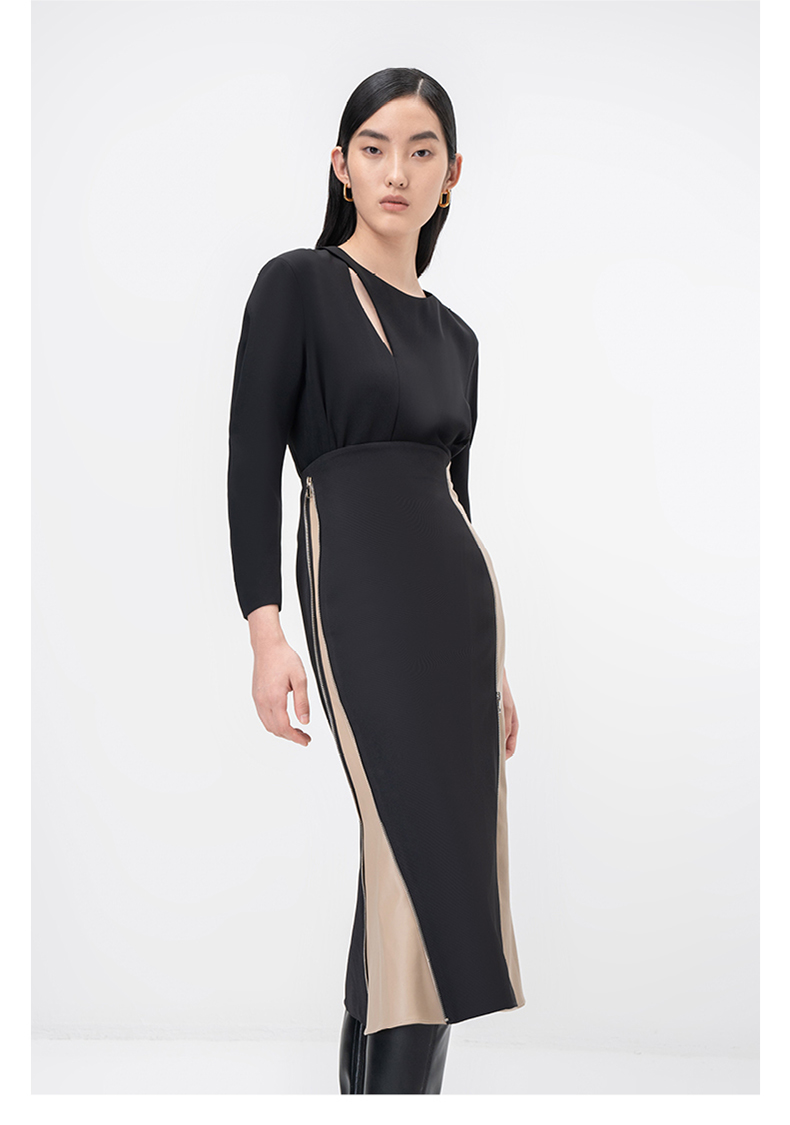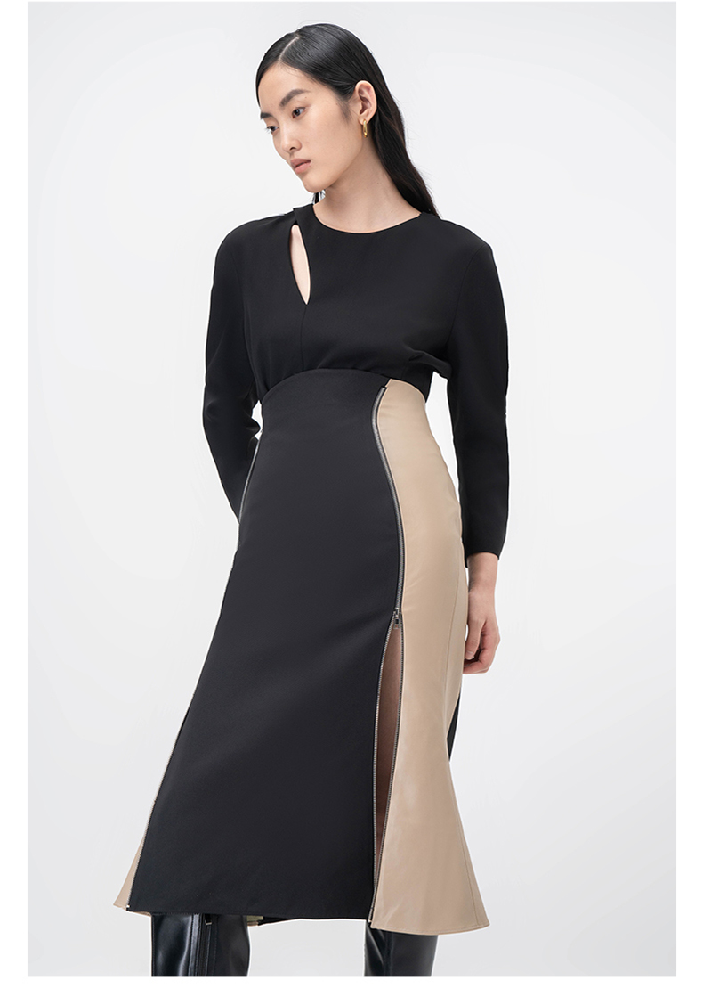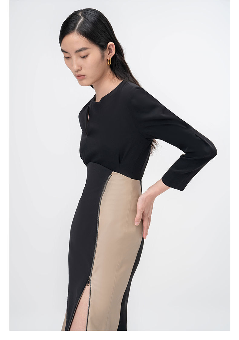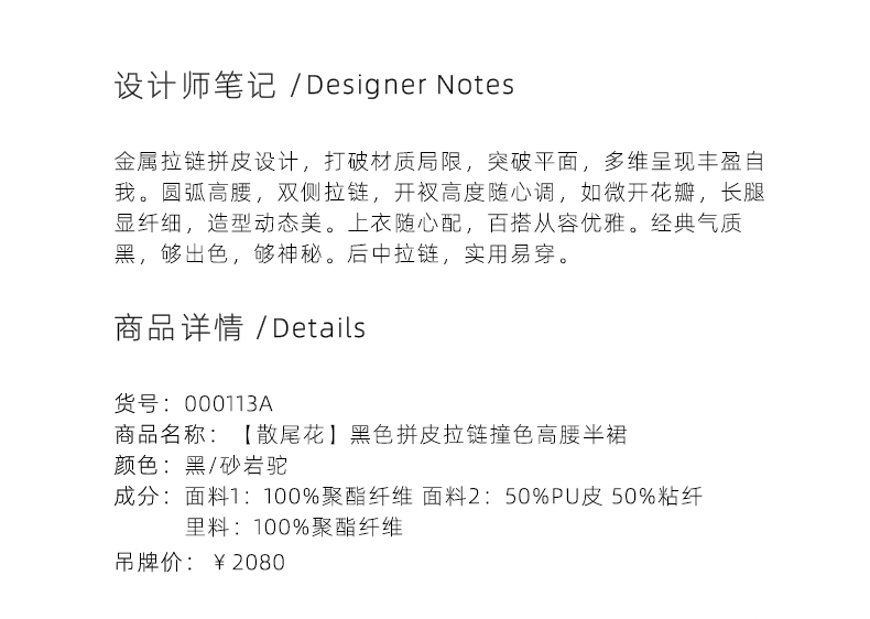 【散尾花】黑色拼皮拉链撞色高腰半裙/000113A