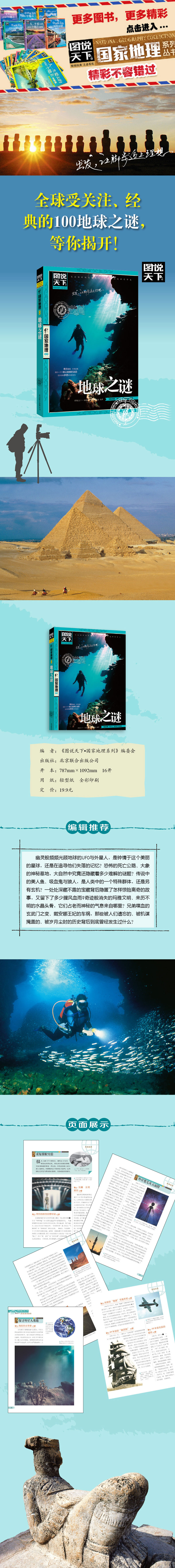 《图说天下·国家地理系列:地球之谜》是一部人文地理巨著,编制出一次穿越时空的梦幻之旅。 《图说天下·国家地理系列:地球之谜》:幽灵般频频光顾地球的uf0与外星人,是钟情于这个美丽的星球,还是在追寻他们失落的记忆?恐怖的死亡公路、大象的神秘墓地,大自然中究竟还隐藏着多少难解的谜题?传说中的美人鱼、吸血鬼与狼人,是人类中的一个特殊群体,还是另有玄机?一处处深藏不露的宝藏背后隐匿了怎样惊险离奇的故事,又留下了多少腥风血雨?奇迹般消失的玛雅文明、来历不明的水晶头骨,它们占老而神秘的气息来自哪里?兄弟喋血的玄武门之变、戴安娜王妃的车祸,那些被人们遗忘的、被机谋掩盖的、被岁月尘封的历史背后到底曾经发生过什么?