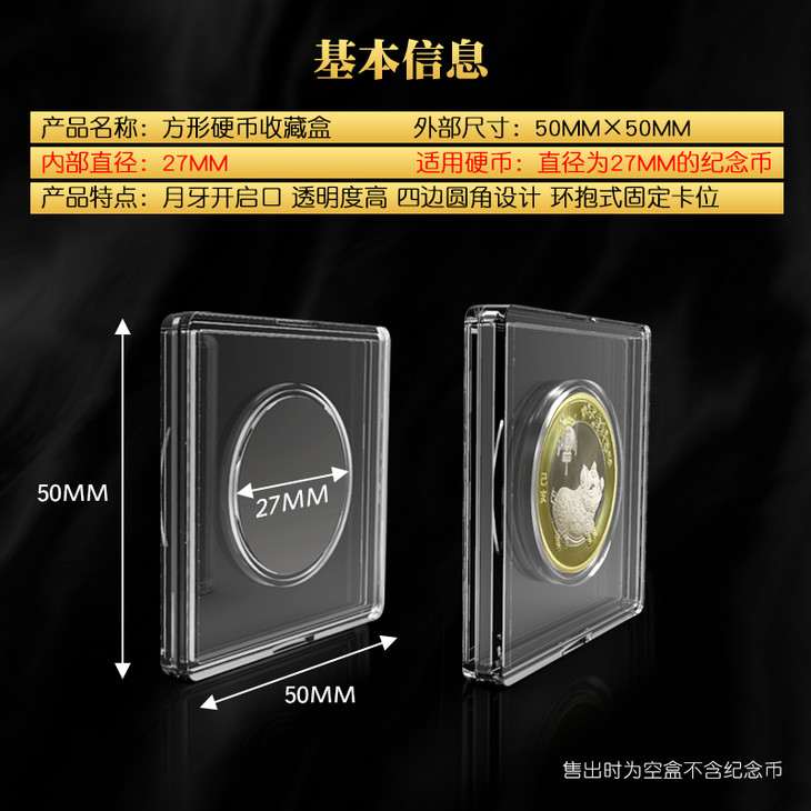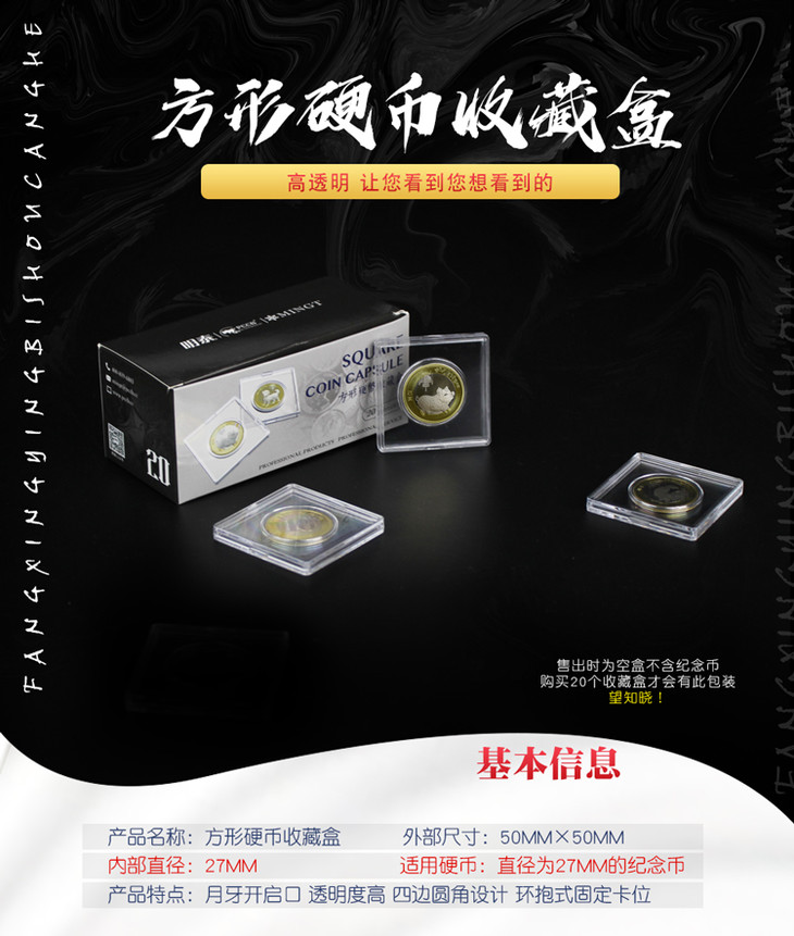 补充说明:本产品出售时不含纪念币。27MM型号的小方盒,适用于直径为27MM的纪念币。