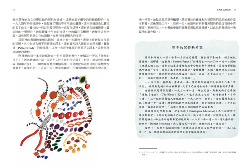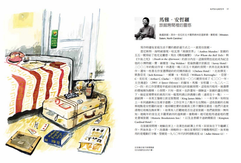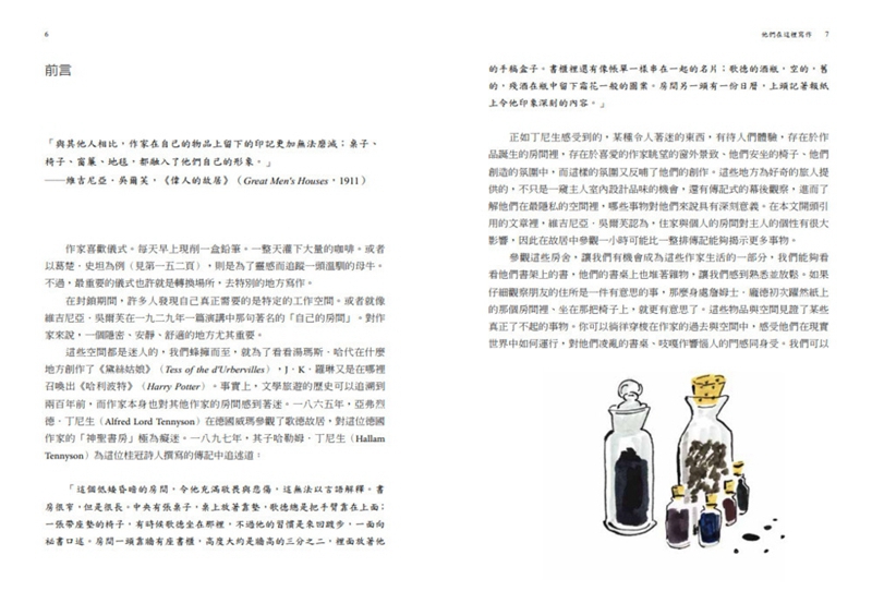 诸如在卧室里的小书桌上找到了写作自由的艾蜜莉.狄金森(现在她的卧室还开放申请两小时写作计画),喜欢在高耸的黄松树下写作的D. H.劳伦斯(DH Lawrence),而勃朗特姊妹在拥挤的共同工作空间中创作(还要保守秘密防偷窥),喜欢DIY的狄更斯甚至尝试组合自己的写作小屋,契诃夫每天如果不先到花园里劳动,他就无法写作;以及喜欢把书桌带着走的亚瑟.柯南.道尔等等。这本书将让读者穿梭时空,探访史上最伟大的作家生平。搭配插画家詹姆斯.欧瑟斯的水彩画,神游每个人的写作空间。