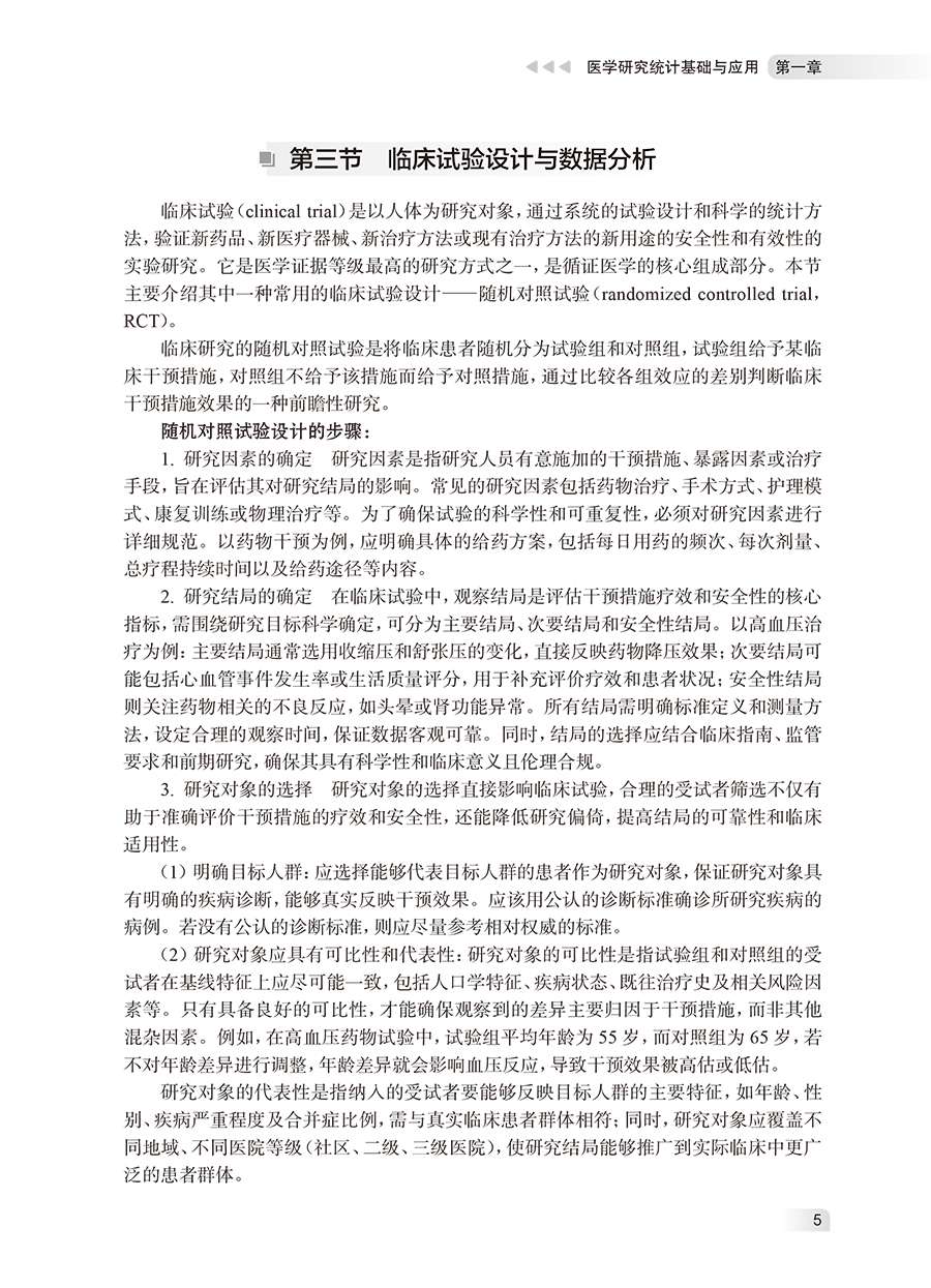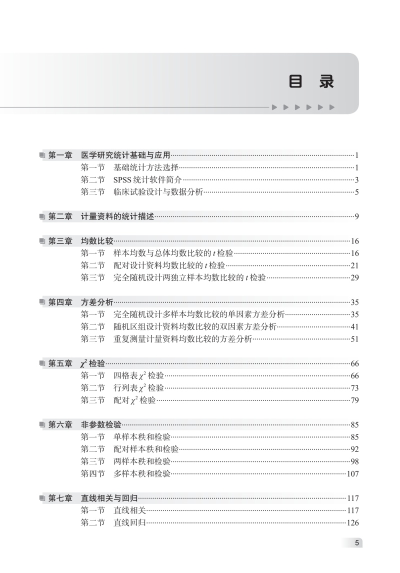 本书在上版基础上进行优化,重新梳理内容结构,包括七章,**章为基础知识,介绍基础统计方法的选择、SPSS软件操作和临床试验设计与数据分析,之后的各章分别介绍常用统计方法。各章节逻辑清晰、层次分明,逐步引导读者从基础概念深入到复杂的应用场景。每一章都以实际案例引入主题,通过实际案例帮助读者深入理解统计方法的应用场景和效果,以图、表等方式直观展示复杂的统计方法和计算过程,节末设置选择题和案例分析题,并以二维码的形式提供案例数据和分析过程,帮助读者巩固理论知识并提高解决实际问题的能力。 本书适用于医学院校本科生及研究生,作为医学统计学课程的推荐教材或教学参考书。同时,本书也可作为医务工作者、科研人员进行研究和数据分析时的重要工具书。