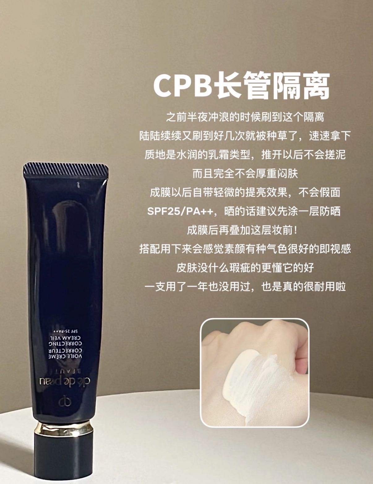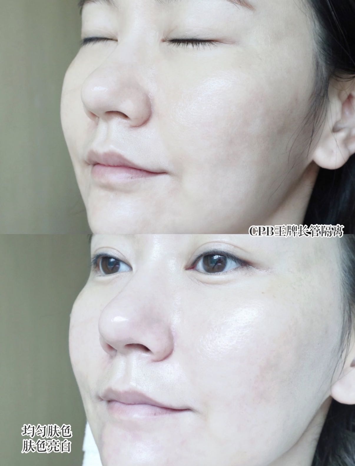 不挑肤质,单涂或者彩妆打底都不错,会有一点粉质感,但是上脸很自然,是那种能够均匀和提亮肤色的,我是妆前隔离用,上脸会有一丢丢遮瑕效果,后续上妆会更服帖,皮肤底子好的的话单用➕个散粉就OK了。