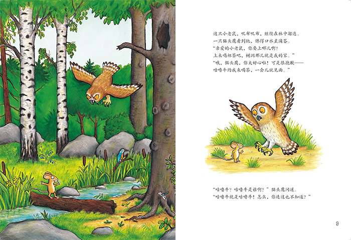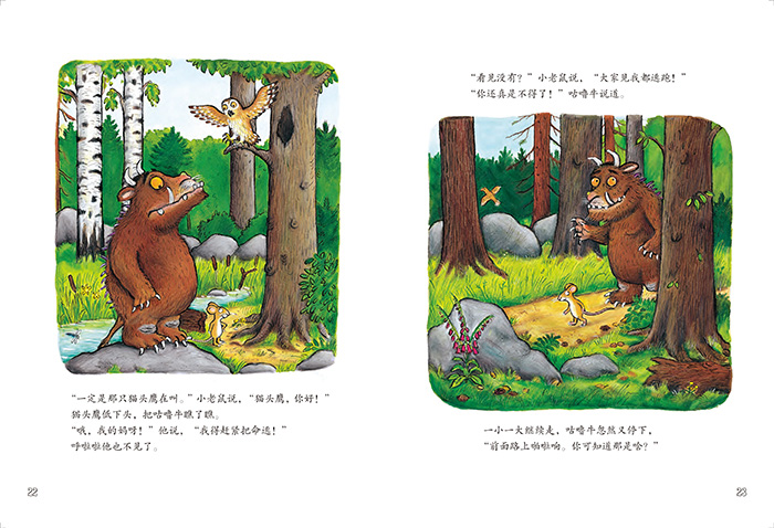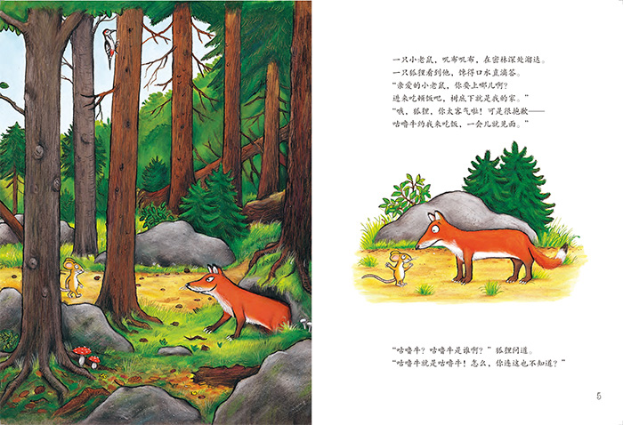 一只小老鼠,叽布叽布,在密林深处溜达。一只狐狸看到他,馋得口水直滴答??????请你跟着小老鼠,走进这茂密的森林,看看这只聪明机灵的小老鼠,碰到了不怀好意的狐狸、猫头鹰、蛇,还有那大怪物咕噜牛,他是怎样一一对付的?