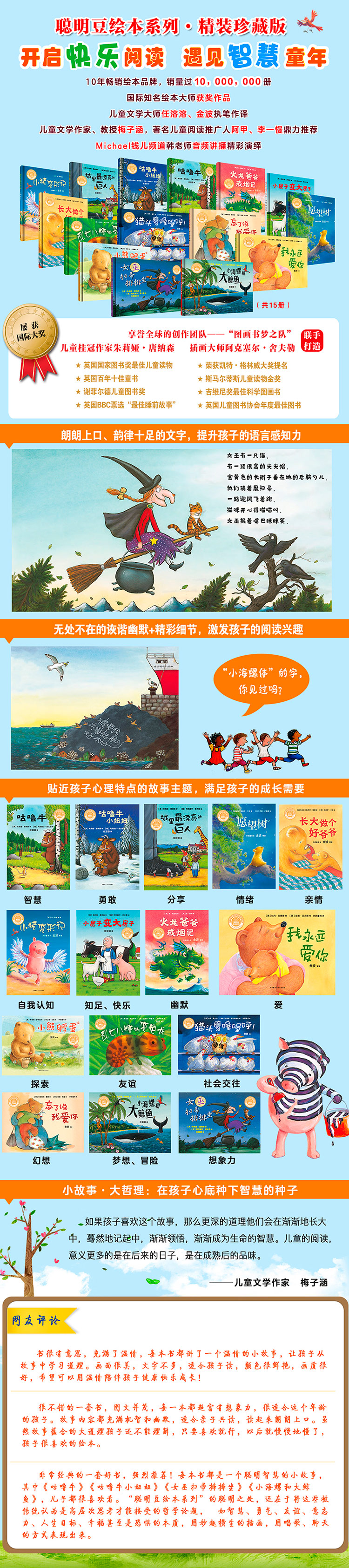 “聪明豆绘本系列”是世界各地优秀图画书的精选合辑。之所以称为“聪明豆”,是因为她的确聪明——轻松幽默的文字、充满想象的图画、妙趣横生的故事,将自我认知、友谊、爱,甚至是生命的逝去等饱含哲理的话题娓娓道来。没有一句教条,却能满足孩子的成长需要;没有一丝说理,却能启发孩子的深入思考;没有一点儿喧闹,却能激起孩子的会心大笑。