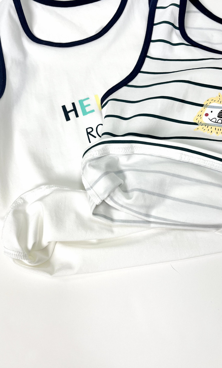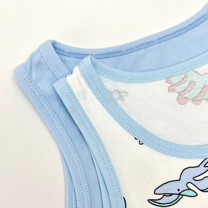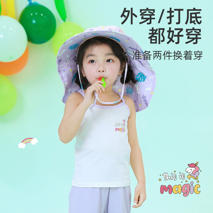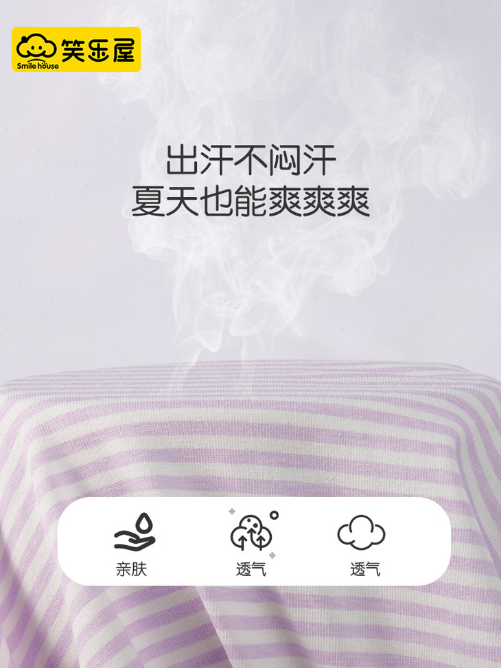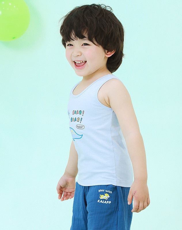 夏天给宝宝穿的背心 一定要宽松、透气、领口低一点的 这样宝宝穿着才舒适 宝宝皮肤很容易出汗 如果穿有领子或领口太高太小 会不利于汗液的蒸发 笑乐屋这款背心套装 在这些细节上都考虑到了~