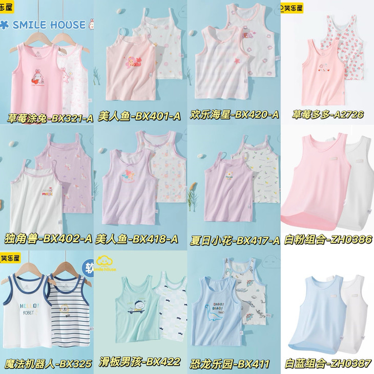 给孩子穿的背心 面料重要,颜值也重要 孩子爱穿的就是笑乐屋这样的 又舒服又好看,还是母婴A类抑菌面料 穿着安全、健康、舒适 全都是有专业机构检测报告的哦 开团一共12款花色,2件一组 图案和配色,都深受小朋友喜欢~