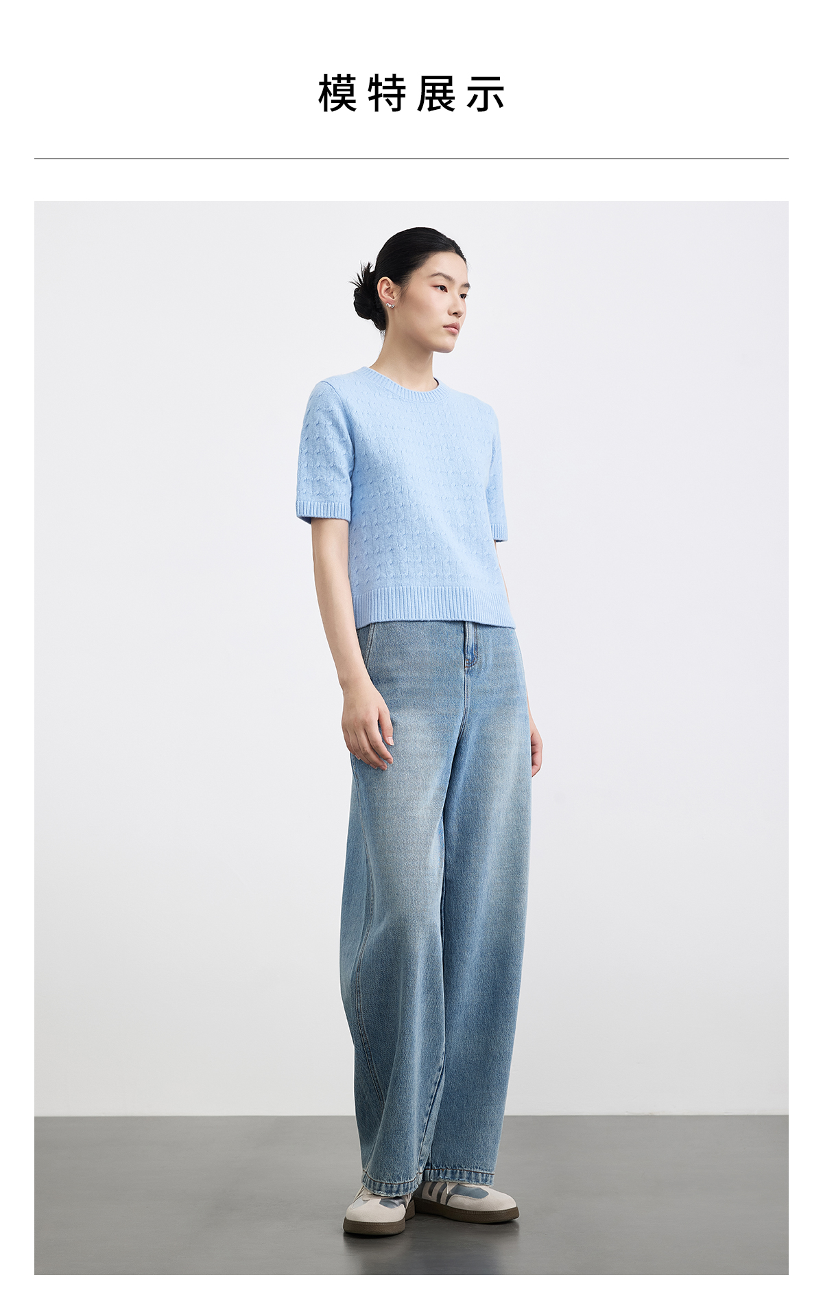 PURE TOUCH浅蓝色圆领绞花短袖针织衫