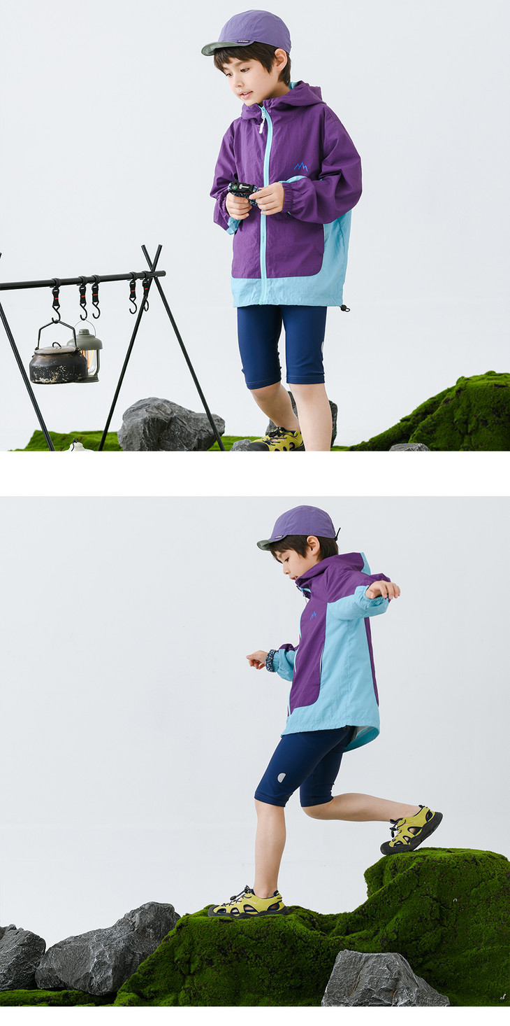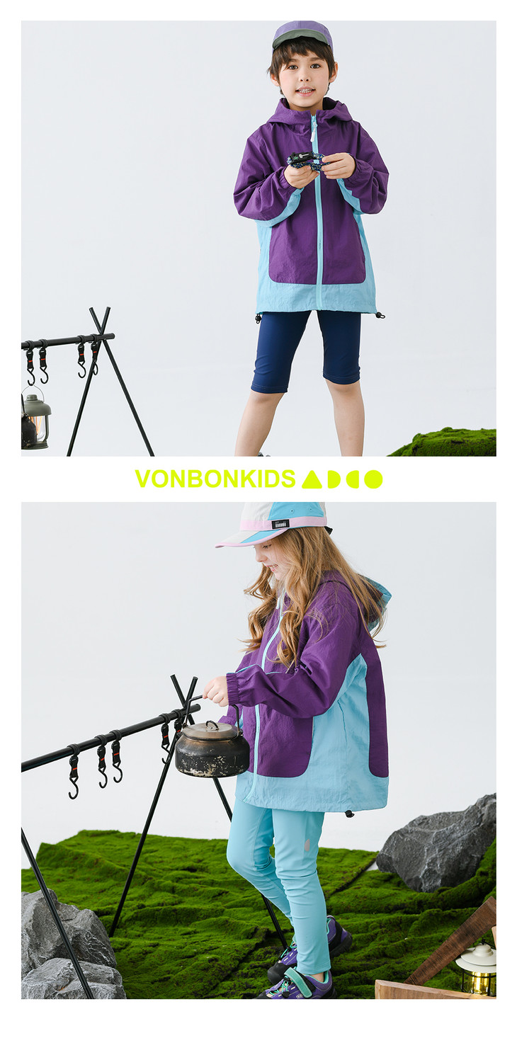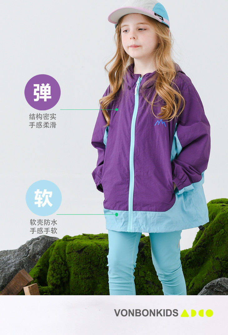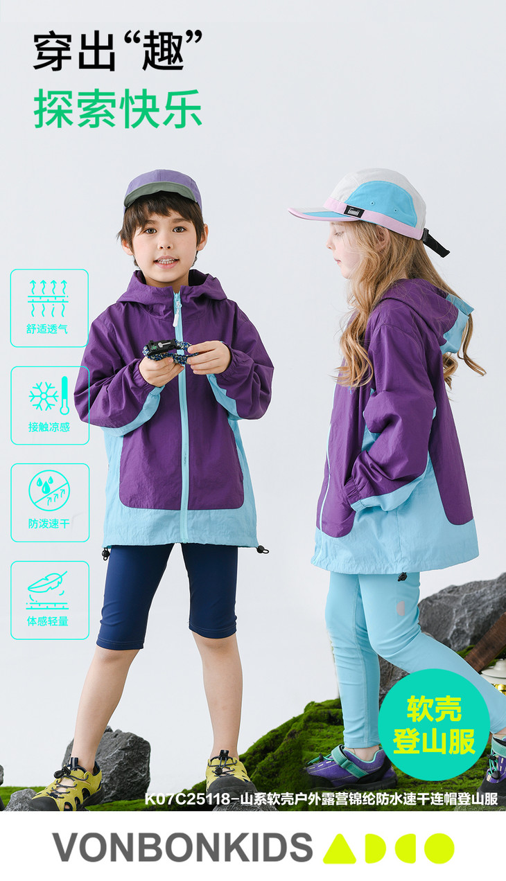 🌈【vonbonkids 山系软壳户外露营锦纶防水速干连帽登山服K07C25118款】 ✅ 锦纶防水速干面料:轻量透气,💥微雨天气也能从容应对,出汗后快速干爽不粘身