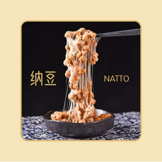 纳豆,起源于中国古代,自秦汉(公元前221年-公元220年)以来开始制作 由黄豆通过纳豆菌(枯草杆菌)发酵制成豆制品 具有黏性,气味较臭,味道微甜,不仅保有黄豆的营养价值、富含维生素K2、提高蛋白质的消化吸收率, 更重要的是发酵过程产生了多种生理活性物质,具有溶解体内纤维蛋白及其他调节生理机能的保健作用。——摘自互联网