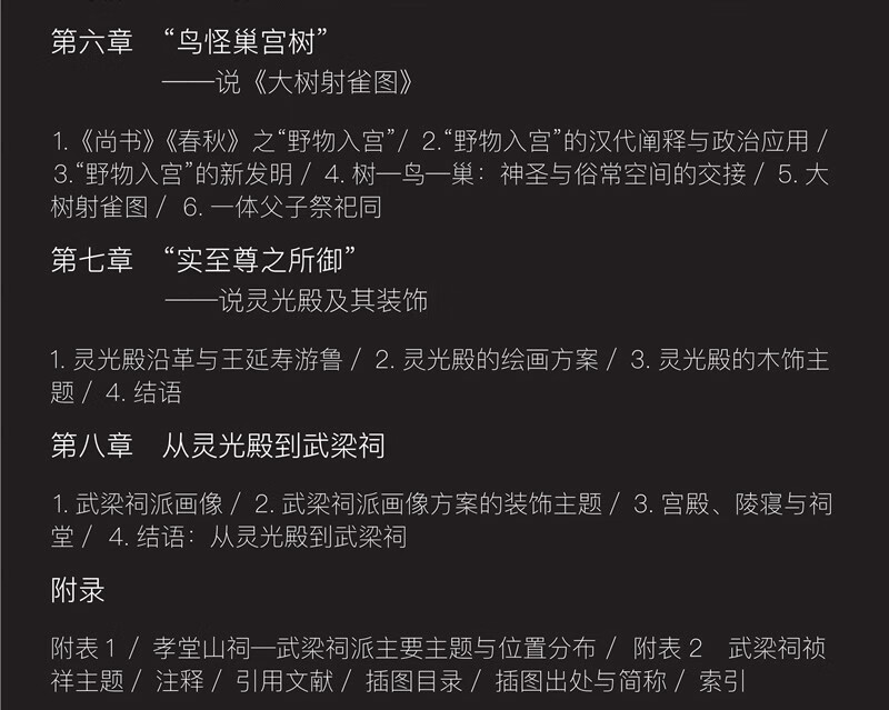 书中在集中探讨了《天帝图》《祥瑞—灾异图》《孔子师老子》《周公辅成王》《楼阁拜谒图》与《车马(卤薄)图》等一系列核心主题之后,更进一步得出结论:中国早期艺术史上,商周纹样传统向汉唐状物传统的转折,完成于两汉之交;转折的外部动力,是汉帝国的意识形态构建与传播。此后以人物叙事为主要内容的状物性绘画,成为统治近千年的新艺术传统。