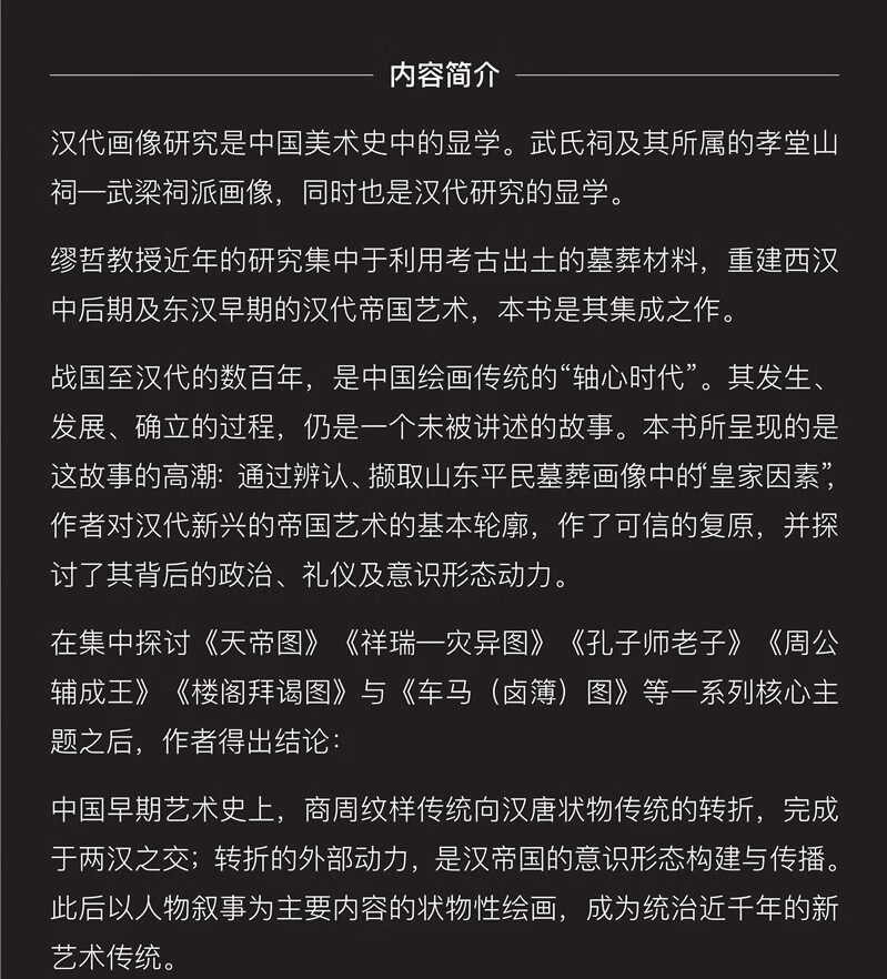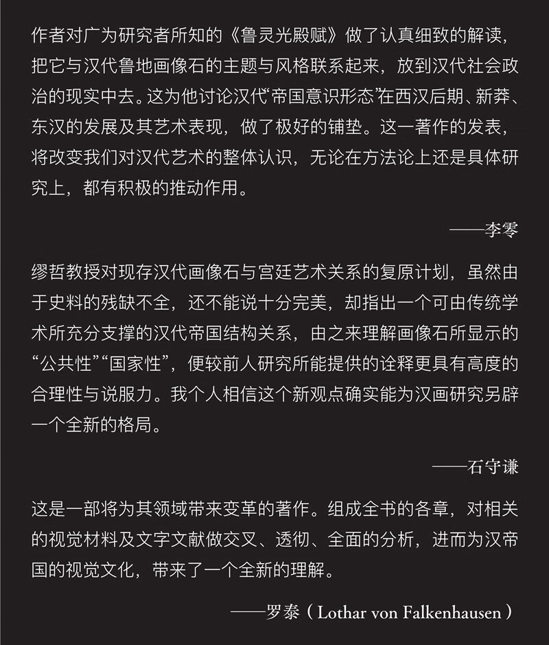 缪哲教授对现存汉代画像石与宫廷艺术关系的复原计划,虽然由于史料的残缺不全,还不能说十分完美,却指出一个可由传统学术所充分支撑的汉代帝国结构关系,由之来理解画像石所显示的“公共性”“国家性”,便较前人研究所能提供的诠释更具有高度的合理性与说服力。我个人相信这个新观点确实能为汉画研究另辟一个全新的格局。——石守谦,台湾“中研院”院士