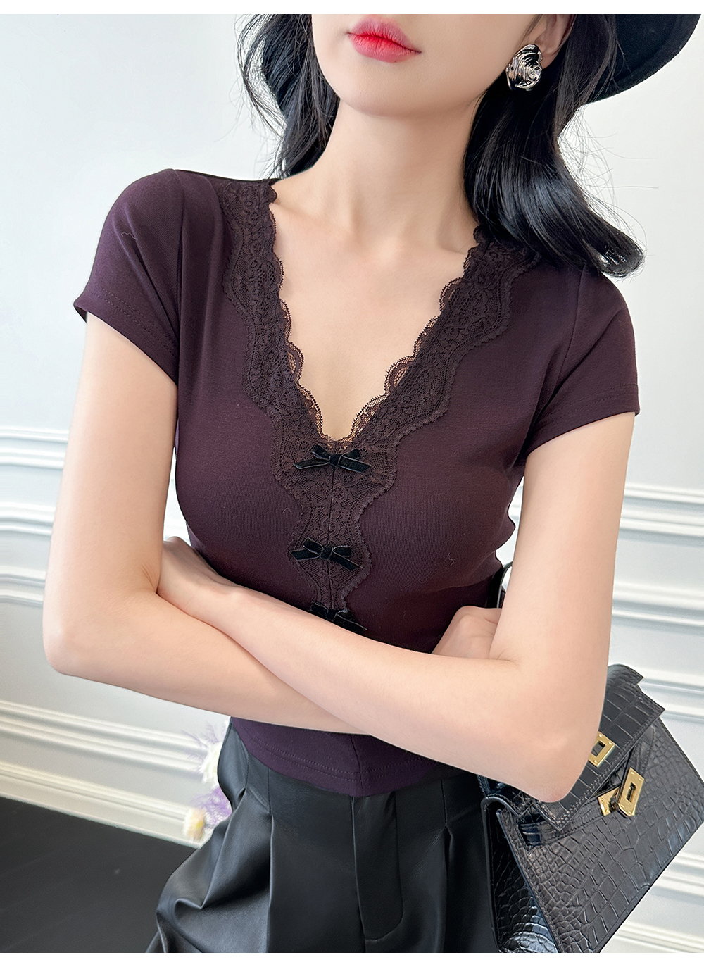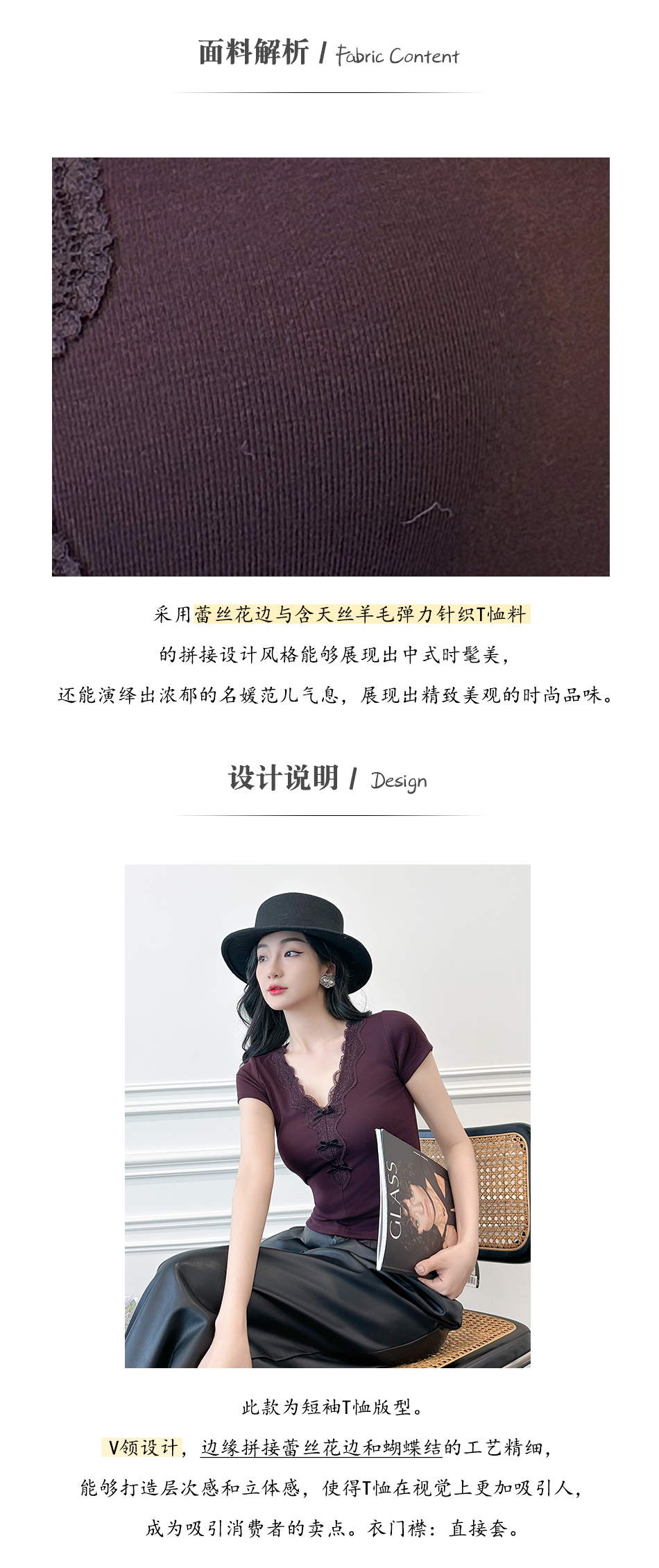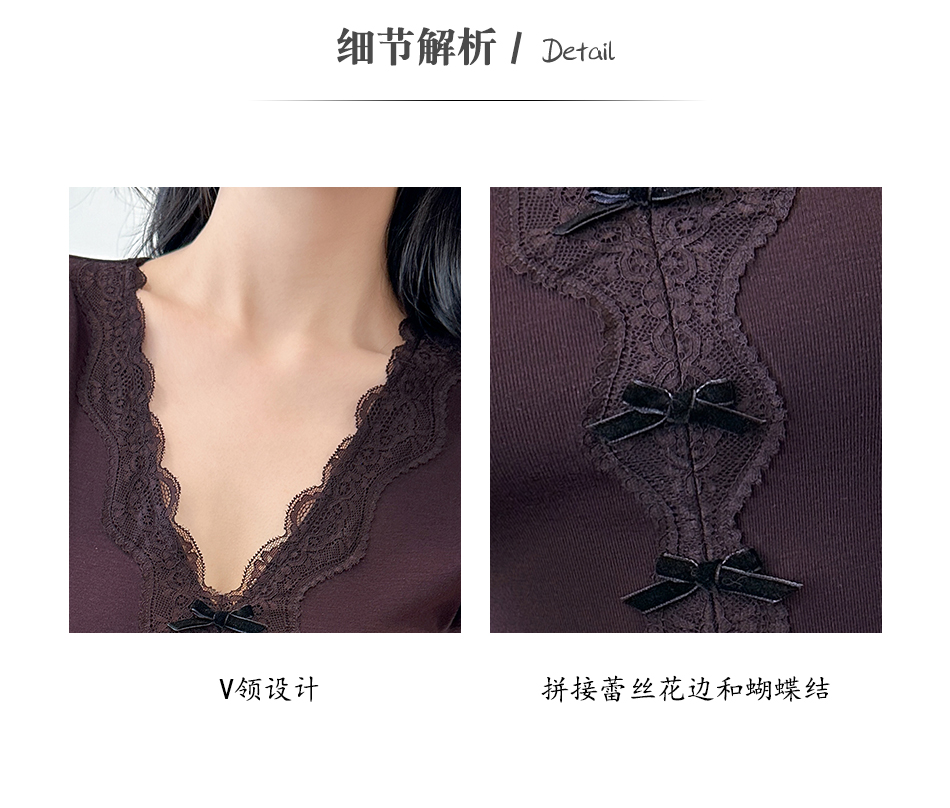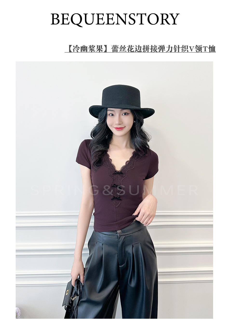 BeQueenStory【冷幽浆果】蕾丝花边拼接设计感时尚弹力针织V领T恤