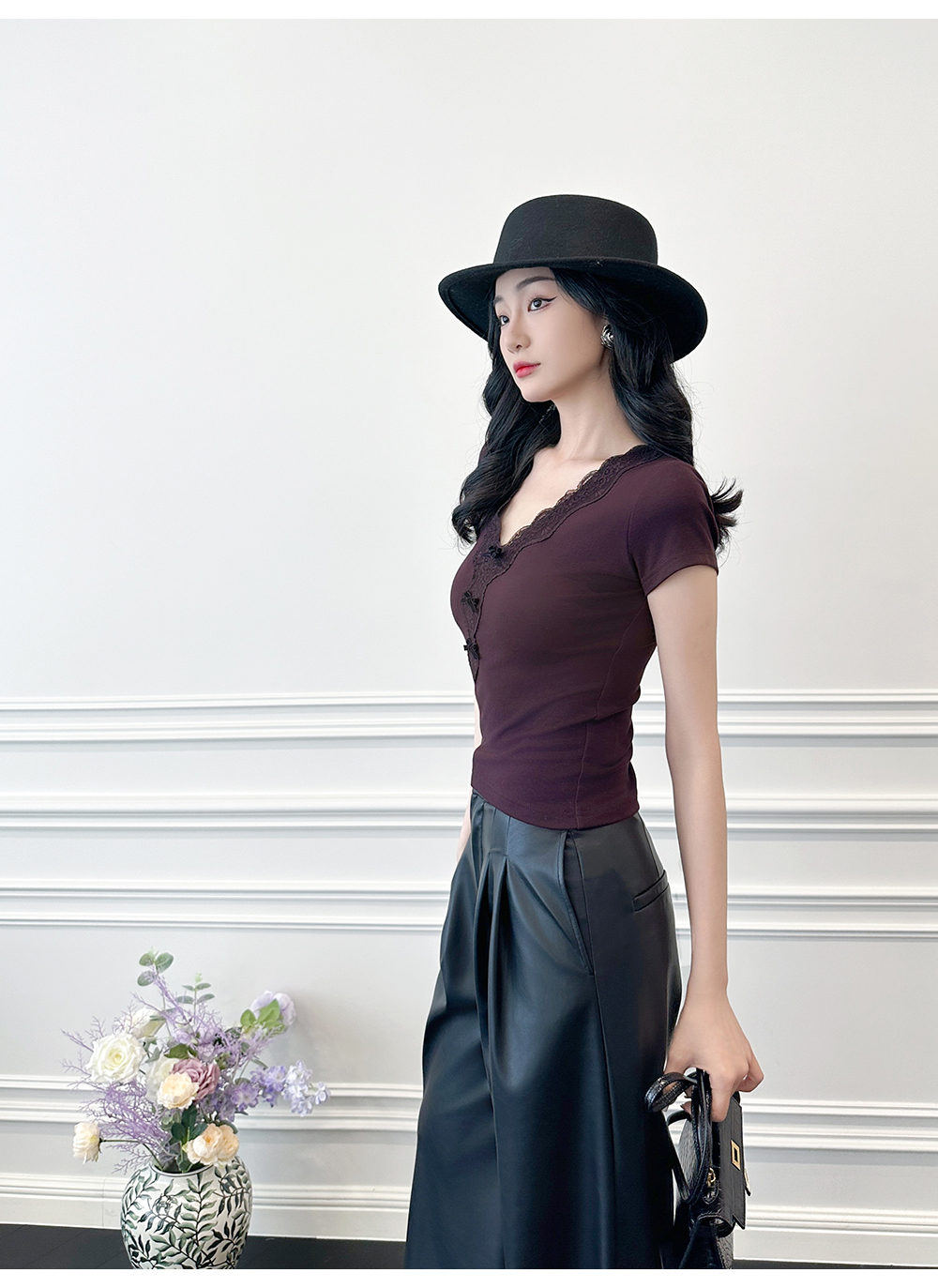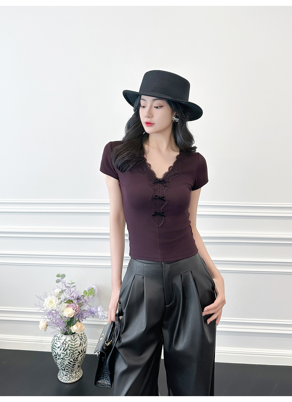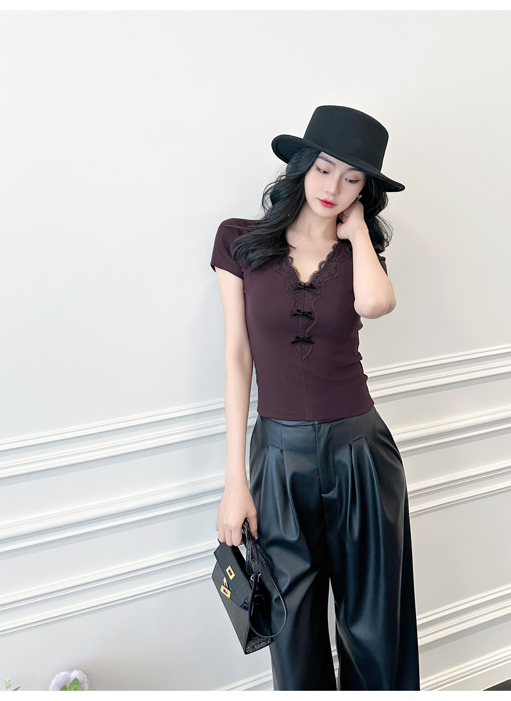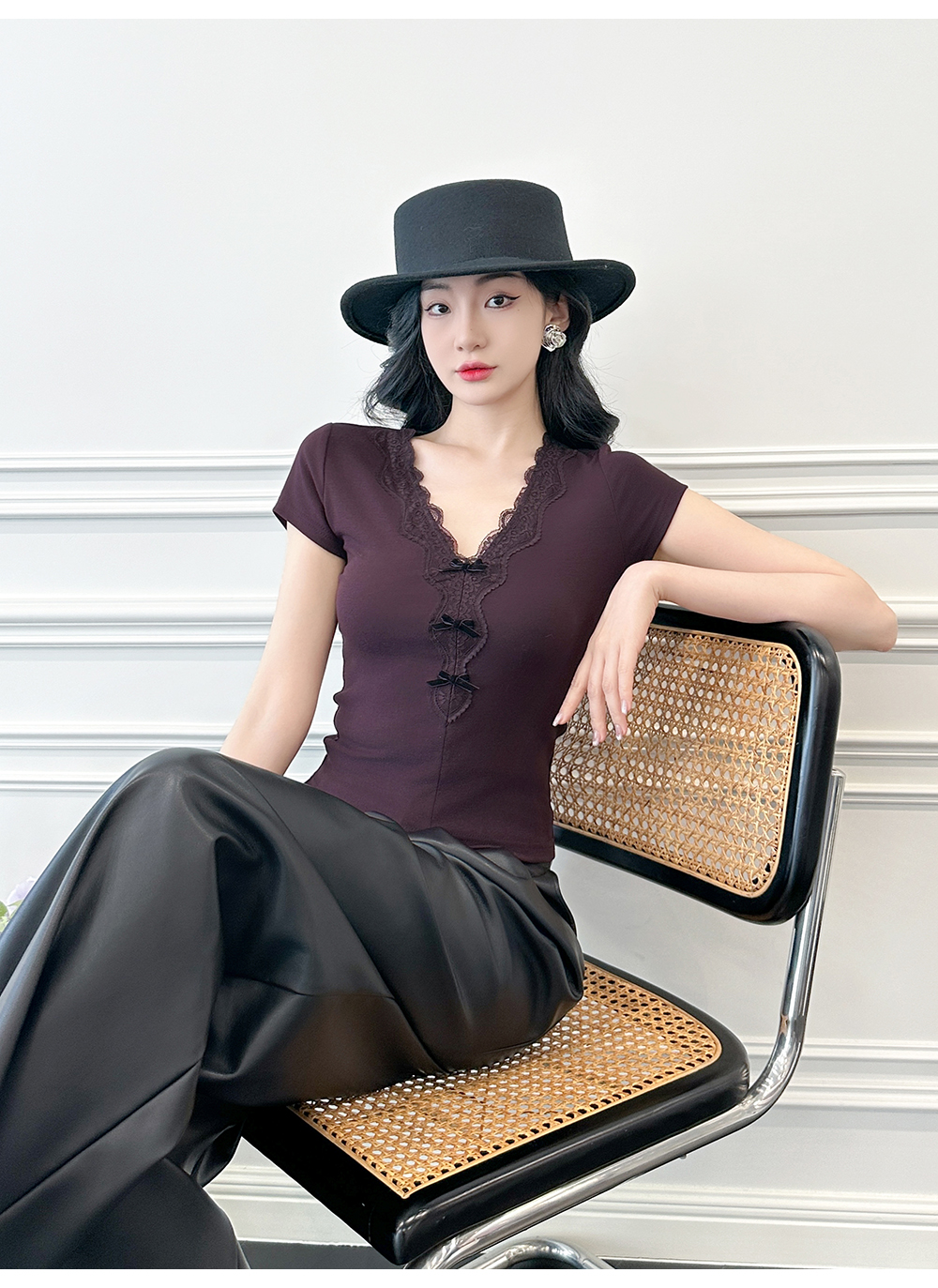 BeQueenStory【冷幽浆果】蕾丝花边拼接设计感时尚弹力针织V领T恤