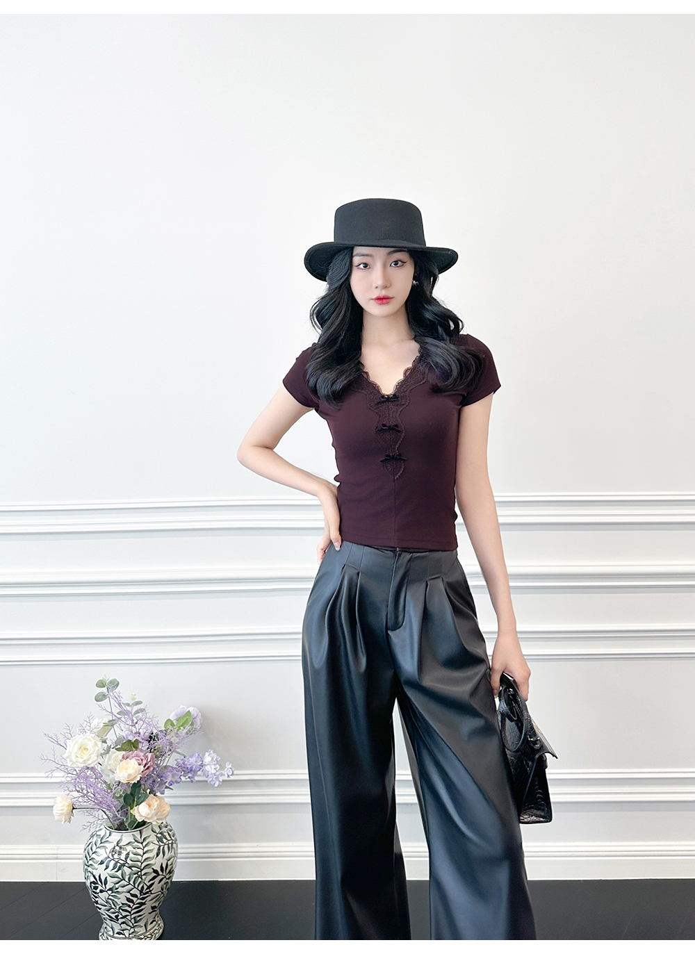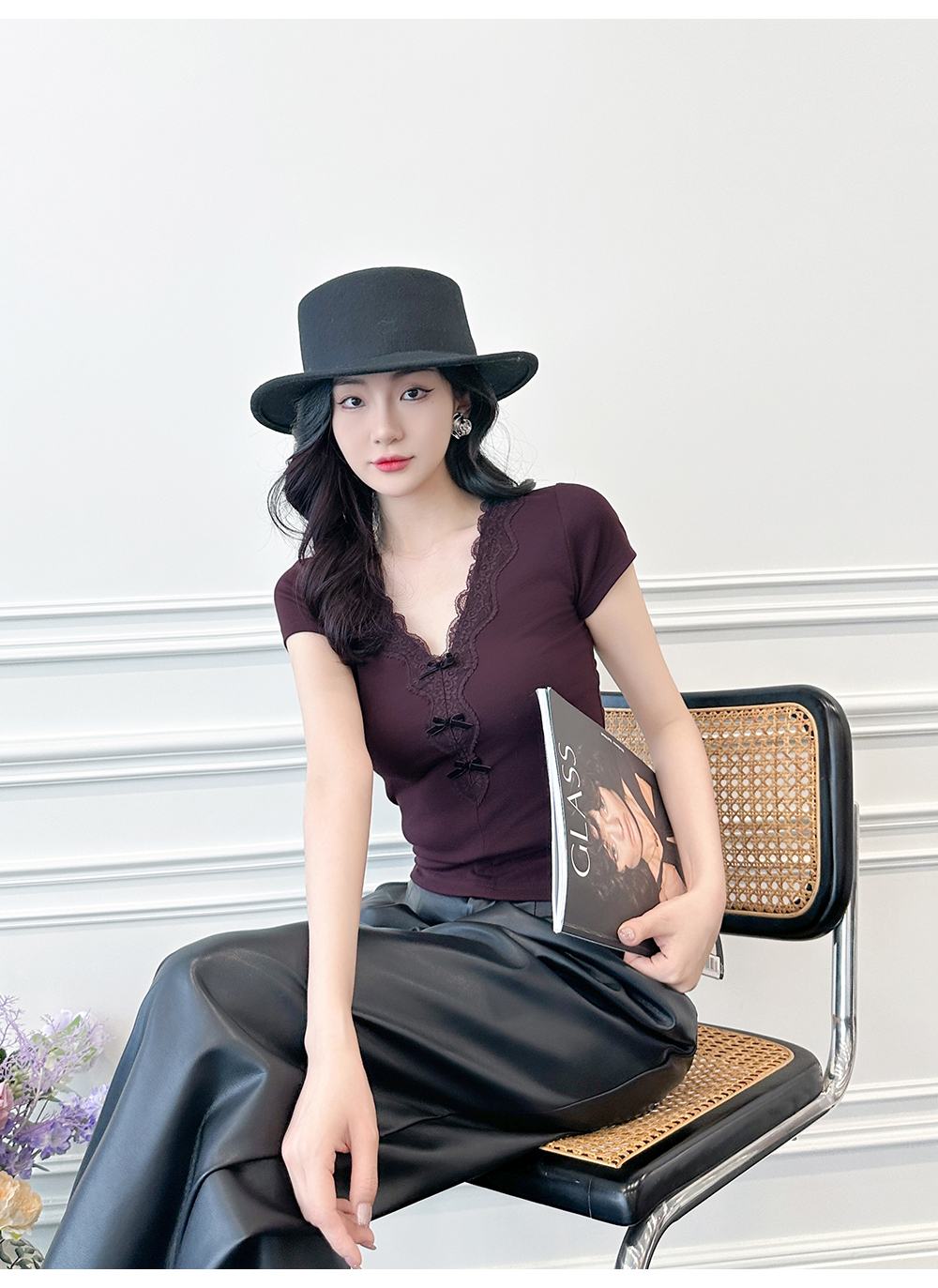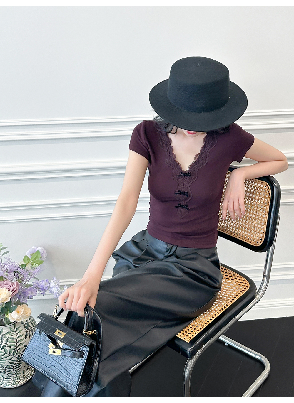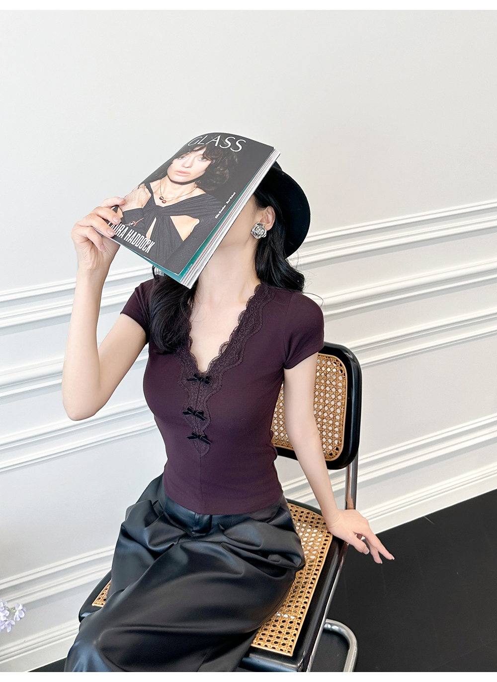 BeQueenStory【冷幽浆果】蕾丝花边拼接设计感时尚弹力针织V领T恤
