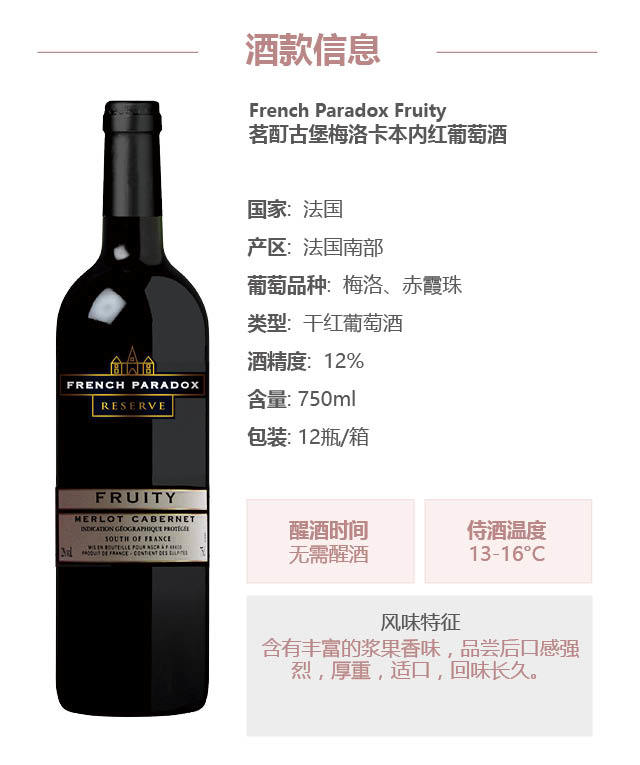 茗酊古堡-梅洛卡本内红葡萄酒 French Paradox Fruity Cabernet Merlot 750ml