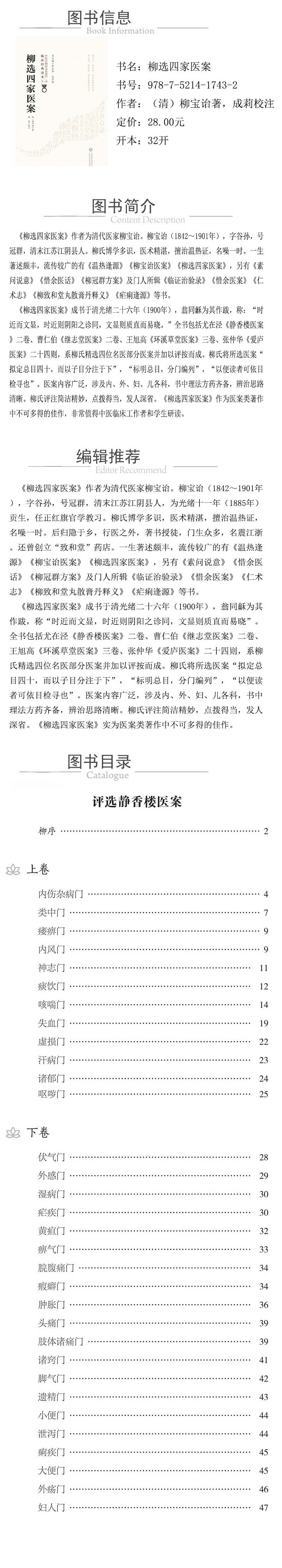 《柳选四家医案》作者为清代医家柳宝诒。柳宝诒(1842~1901年),字谷孙,号冠群,清末江苏江阴县人。柳氏博学多识,医术精湛,擅治温热证,名噪一时。一生著述颇丰,流传较广的有《温热逢源》《柳宝诒医案》《柳选四家医案》,另有《素问说意》《惜余医话》《柳冠群方案》及门人所辑《临证治验录》《惜余医案》《仁术志》《柳致和堂丸散膏丹释义》《疟痢逢源》等书。《柳选四家医案》成书于清光绪二十六年(1900年),翁同龢为其作跋,称:"时近而文显,时近则阴阳之诊同,文显则质直而易晓。"全书包括尤在泾《静香楼医案》二卷、曹仁伯《继志堂医案》二卷、王旭高《环溪草堂医案》三卷、张仲华《爱庐医案》二十四则,系柳氏精选四位名医部分医案并加以评按而成。柳氏将所选医案"拟定总目四十,而以子目分注于下","标明总目,分门编列","以便读者可依目检寻也"。医案内容广泛,涉及内、外、妇、儿各科,书中理法方药齐备,辨治思路清晰......