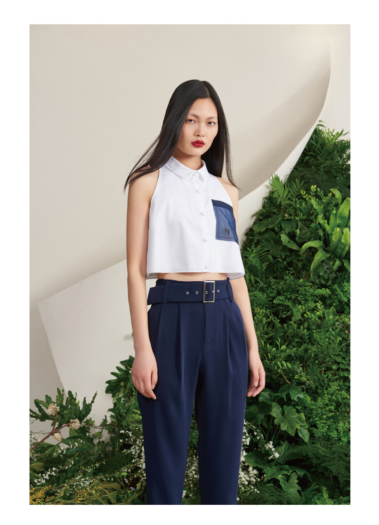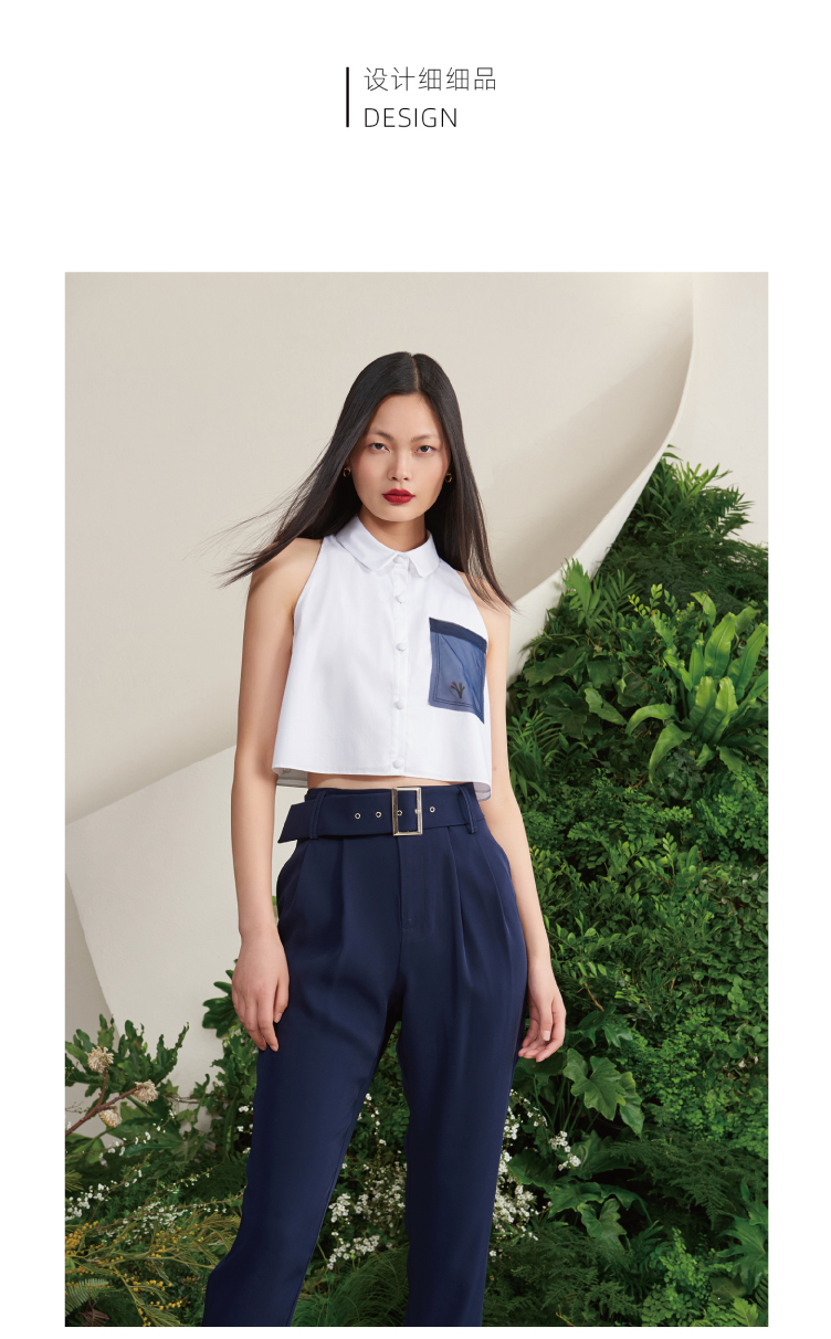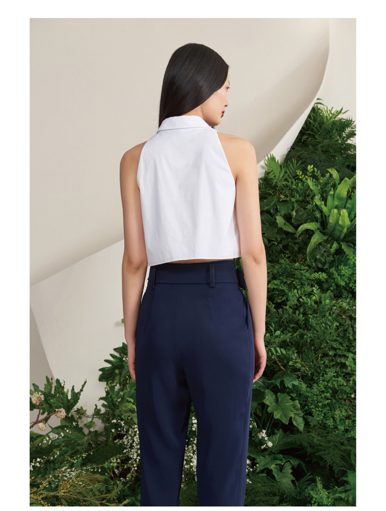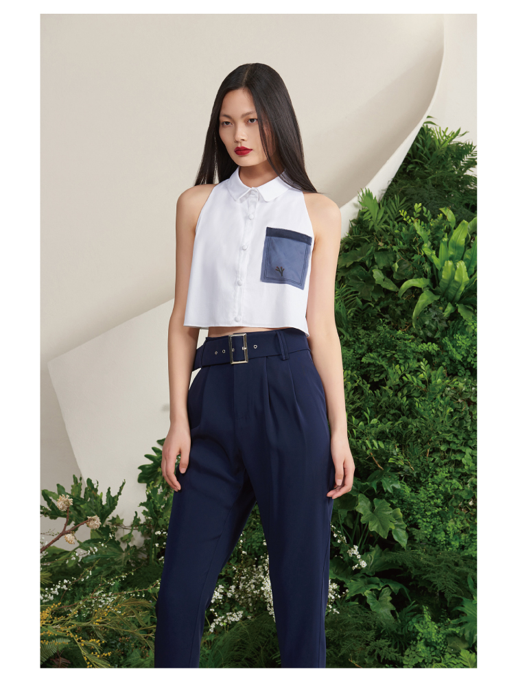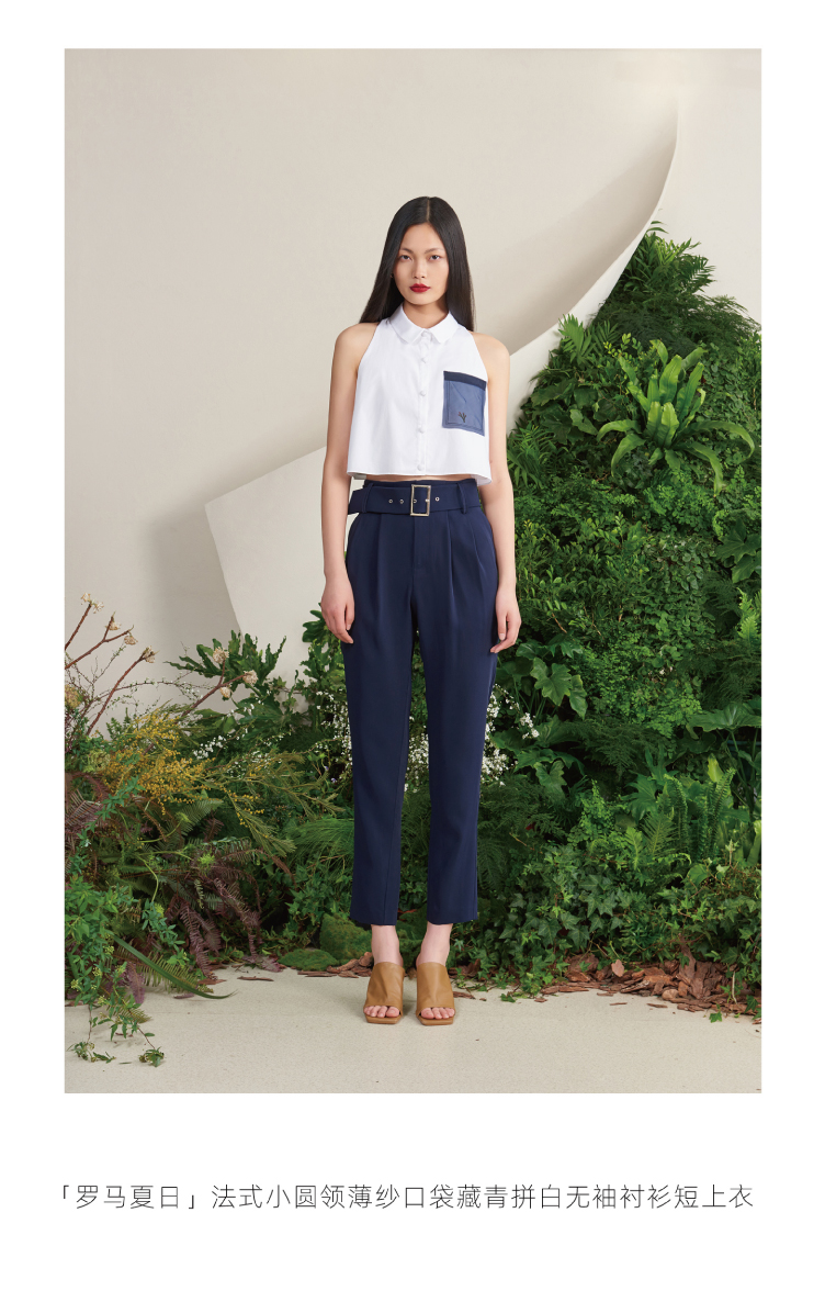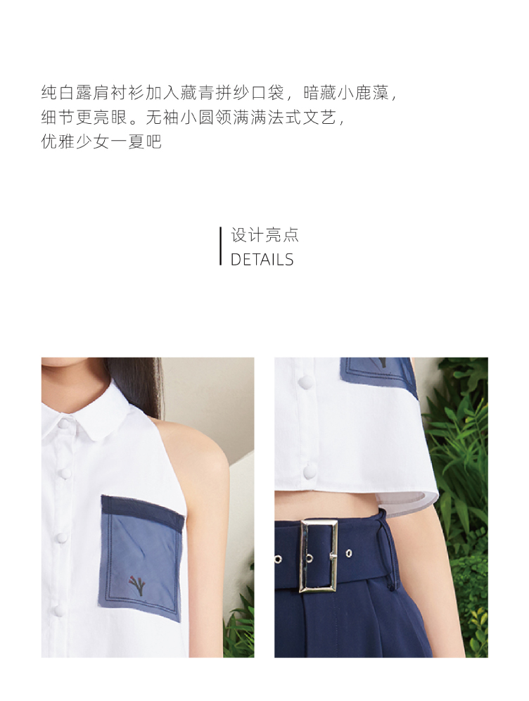 【罗马夏日】法式小圆领薄纱口袋藏青拼白无袖衬衫短上衣/00188