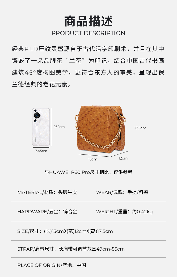 保兰德PLD东方雅奢经典系列单肩斜链条包小方包头层牛皮通勤必备女包