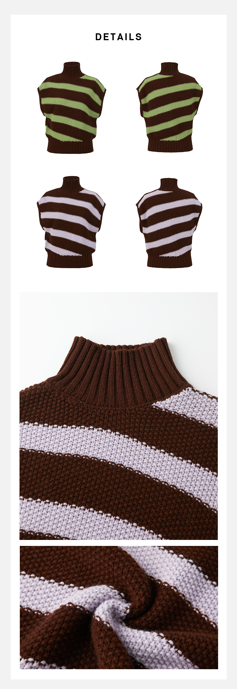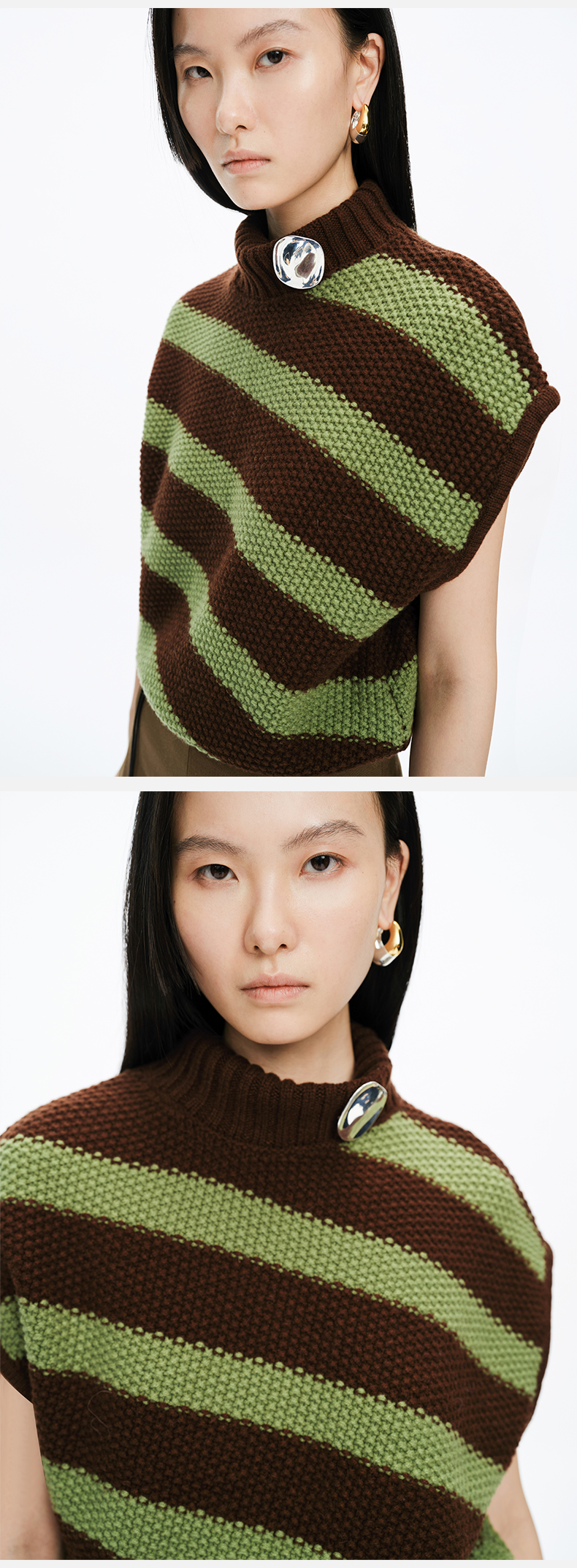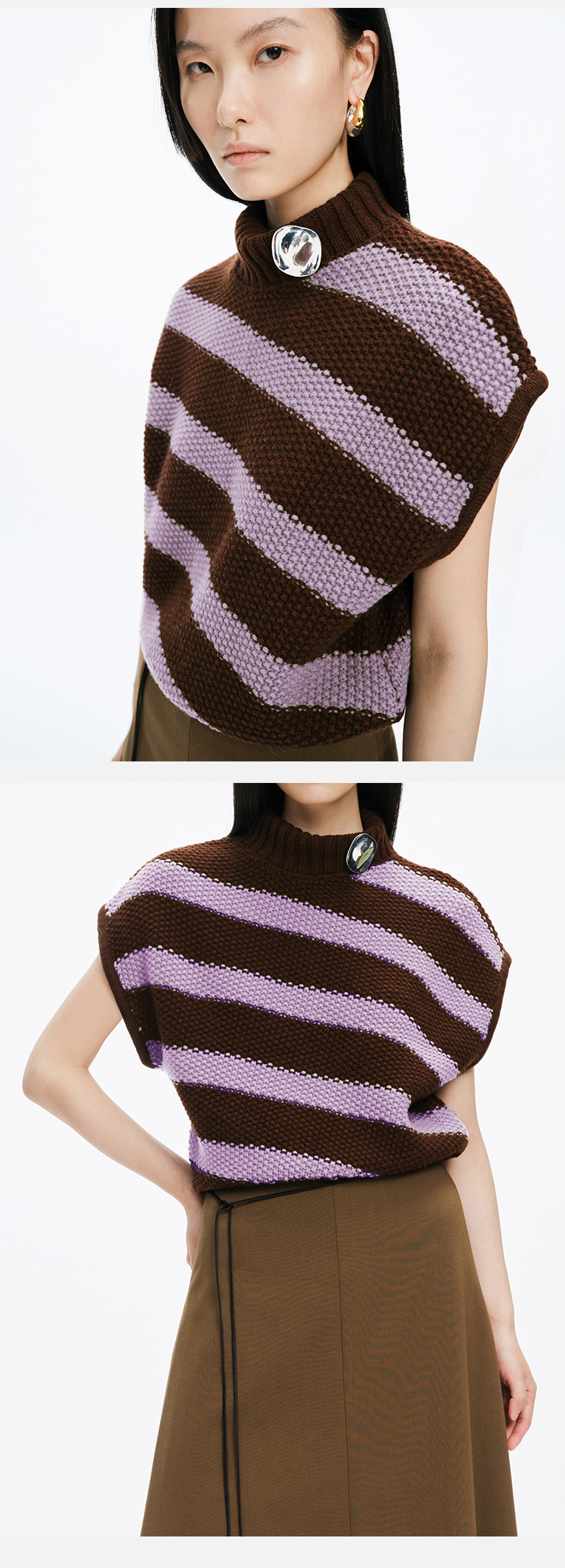 HIDEMI 美利奴羊毛粗花针斜条纹立领廓形落肩马夹 菠萝绿/香芋紫