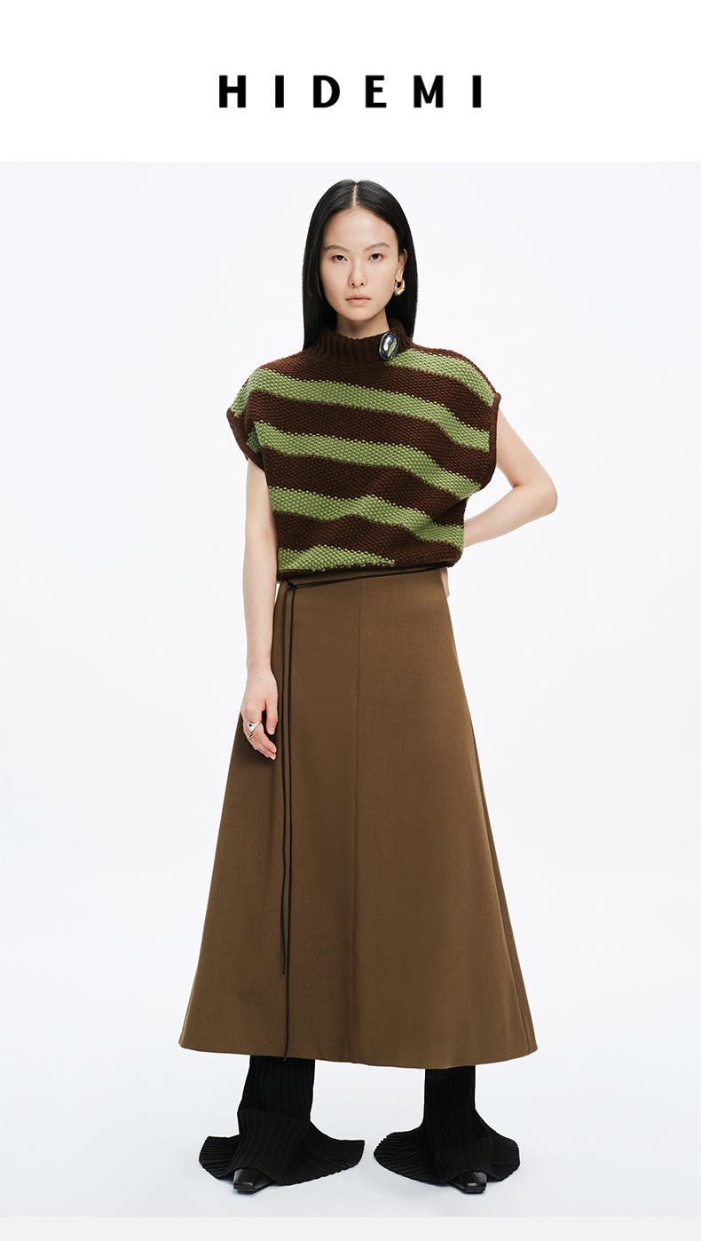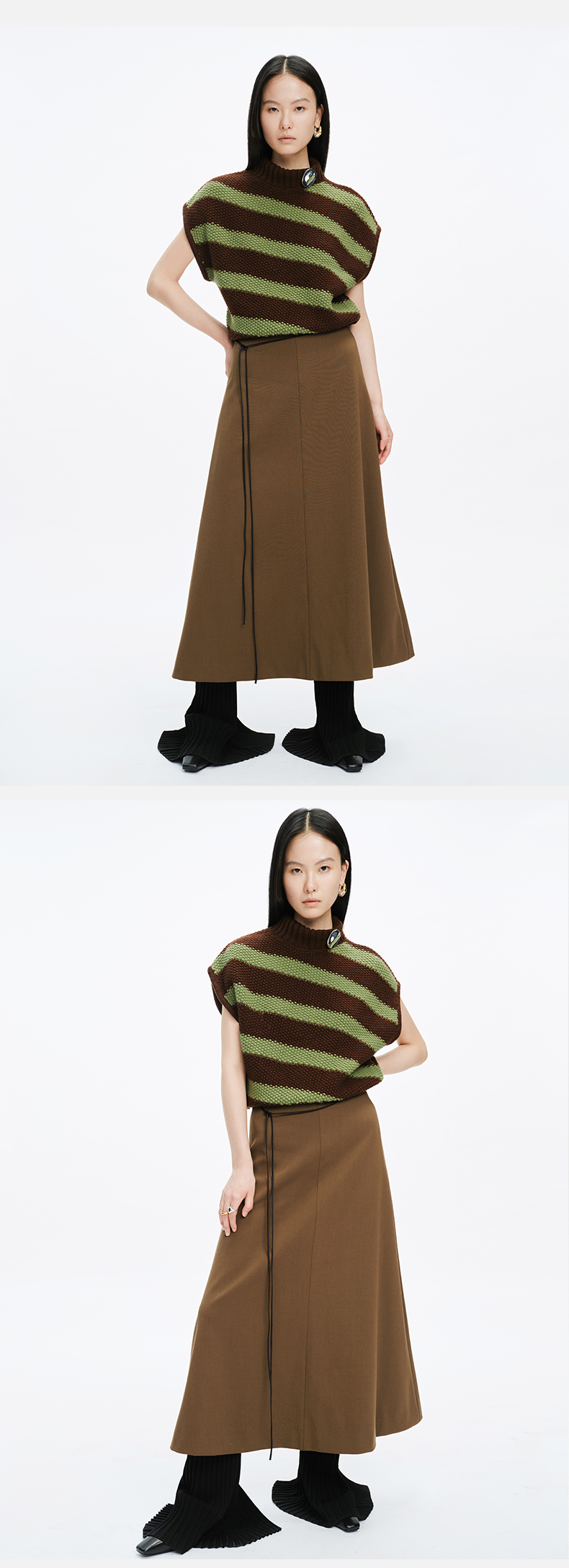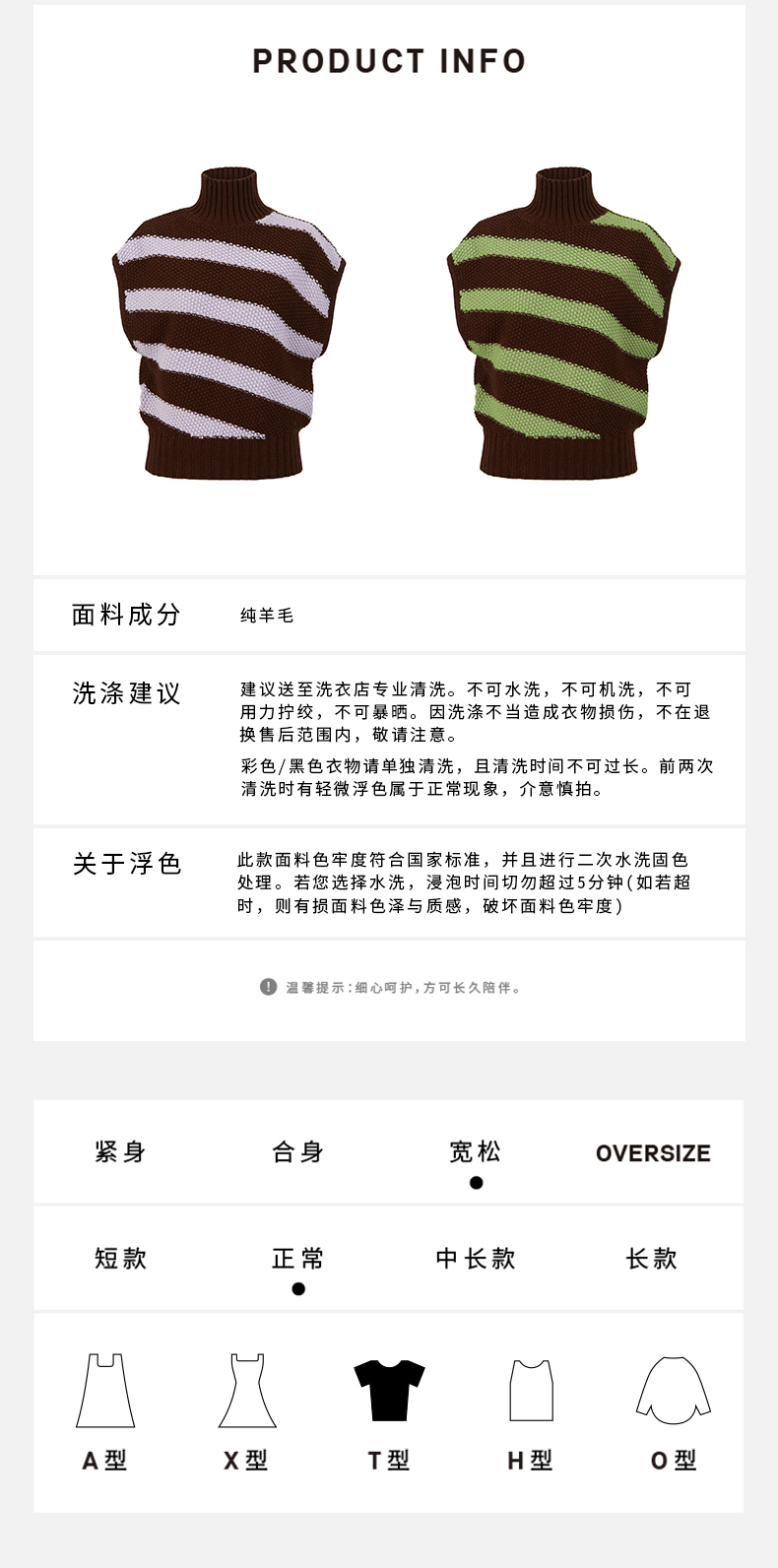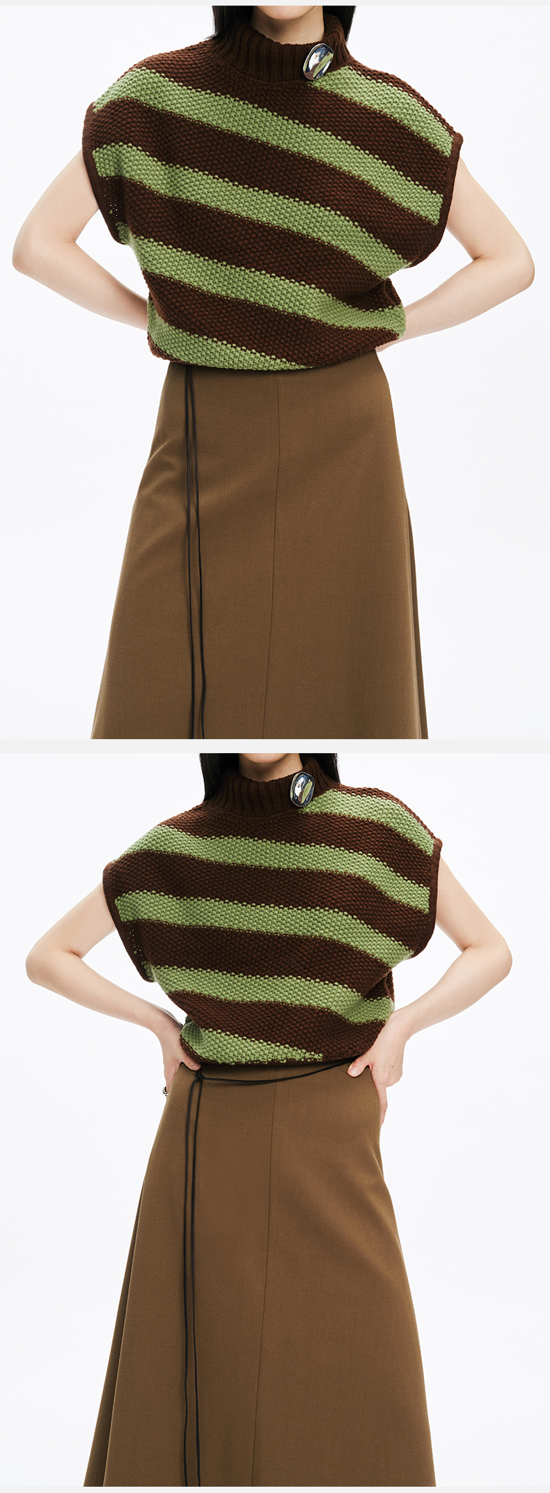 HIDEMI 美利奴羊毛粗花针斜条纹立领廓形落肩马夹 菠萝绿/香芋紫