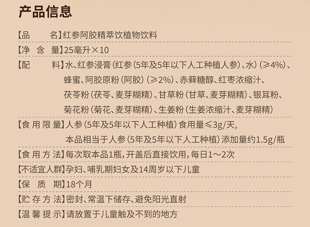 红参阿胶精萃饮植物饮料25ml*10瓶/盒
