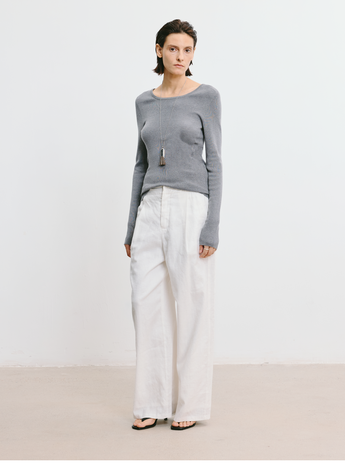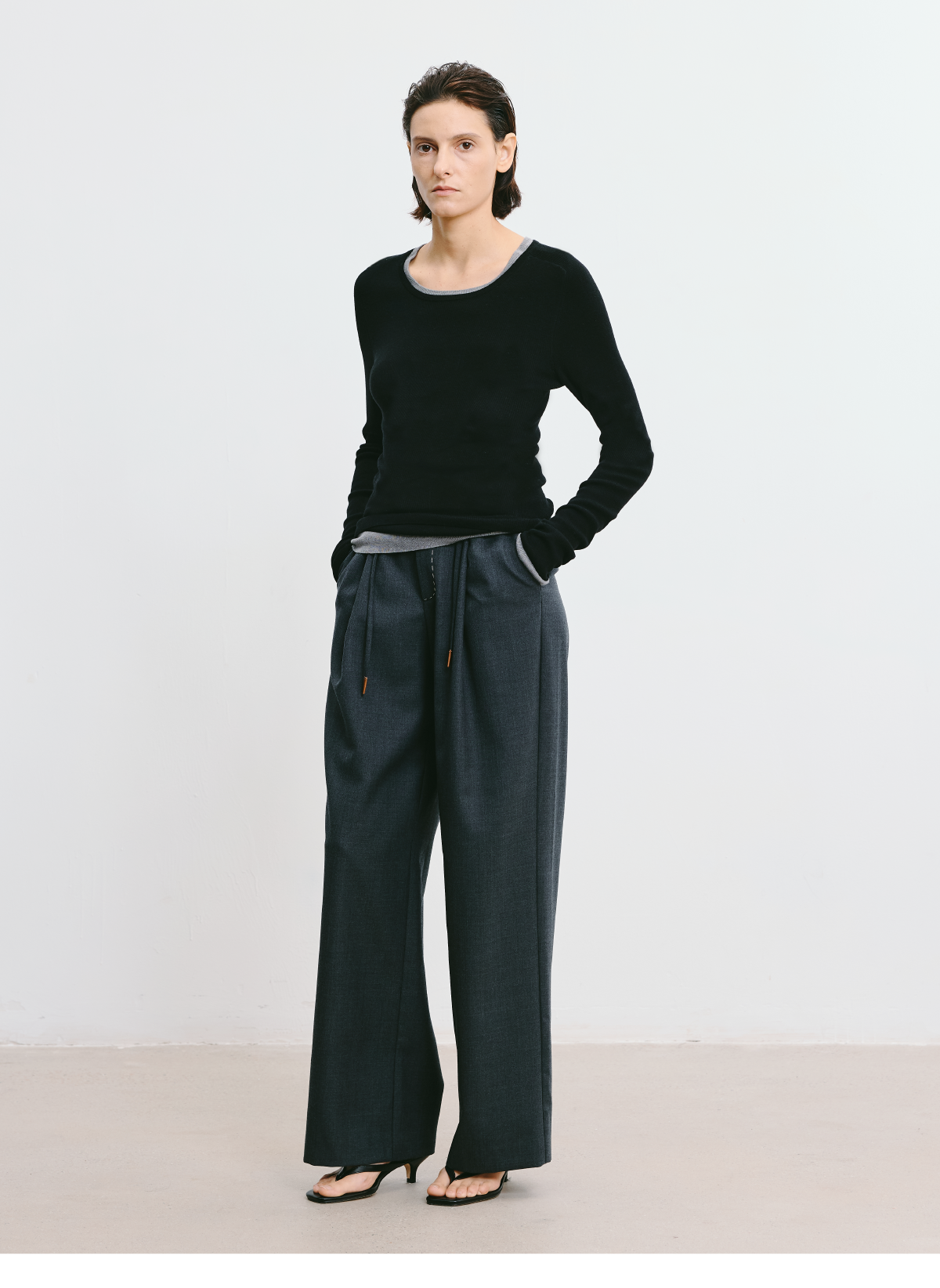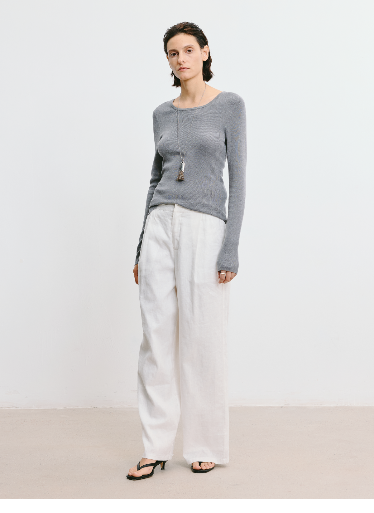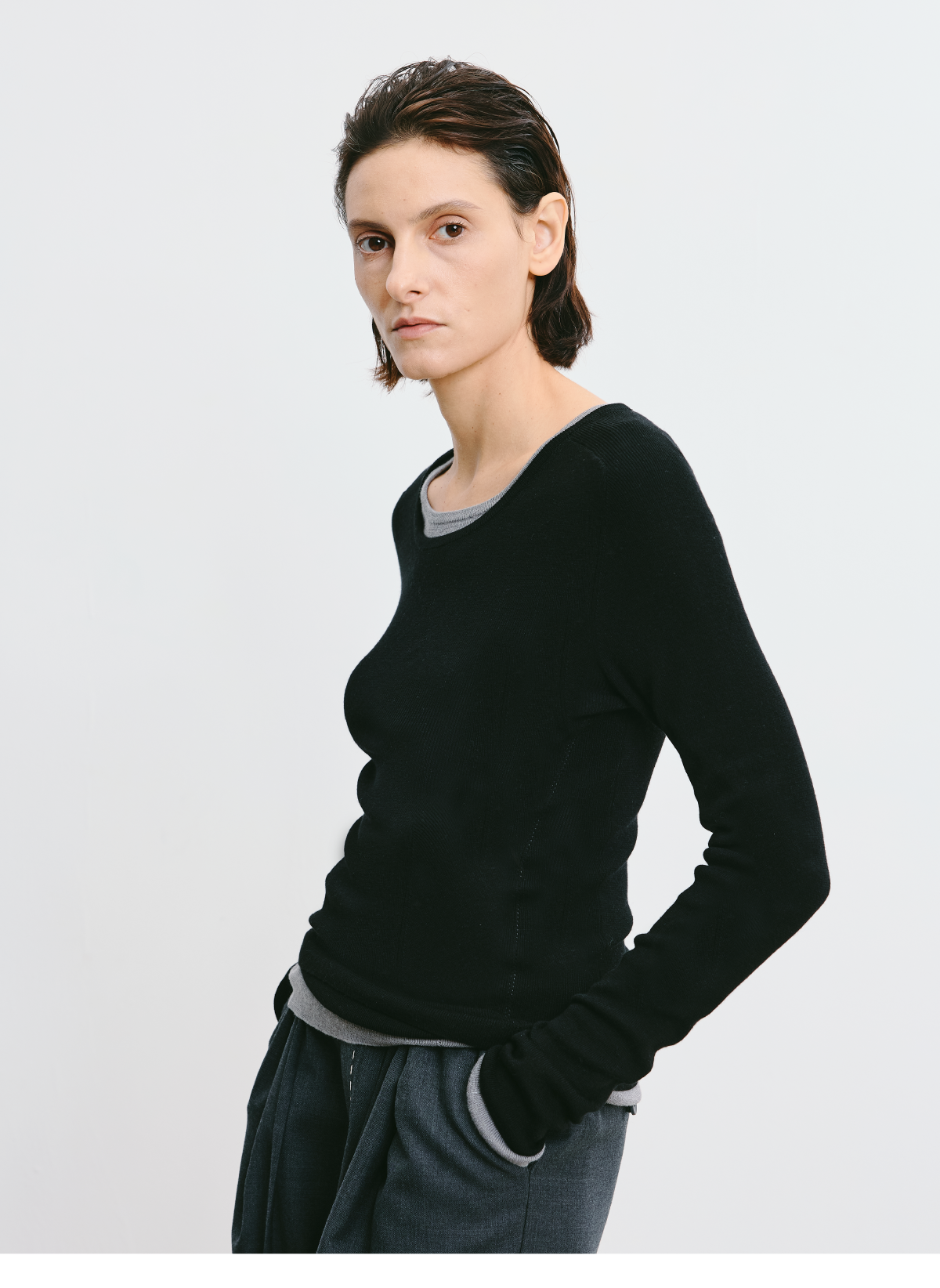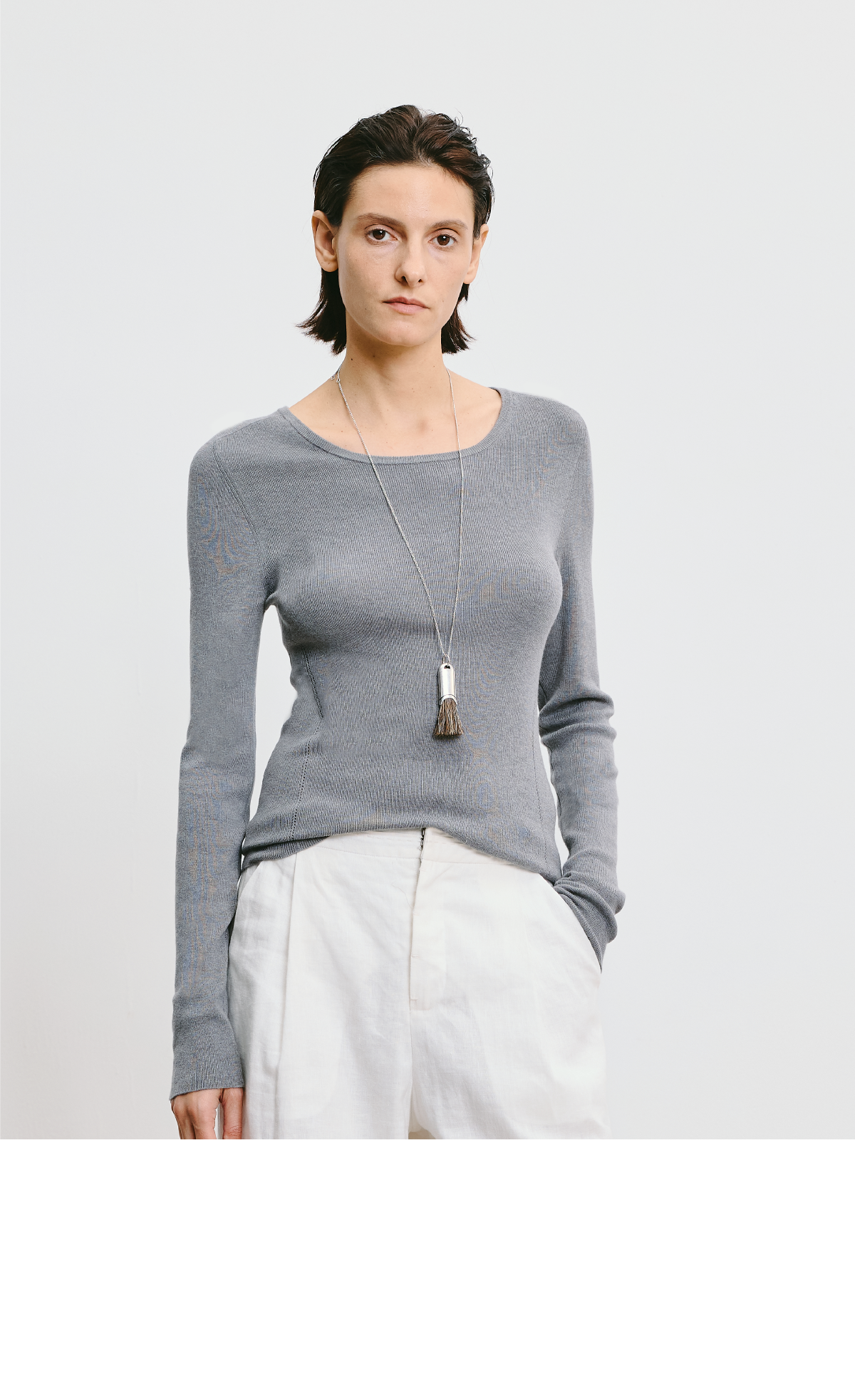 LIYIHAN 2026春新款醋酸羊绒圆领灰色打底针织衫女毛衣小众设计感