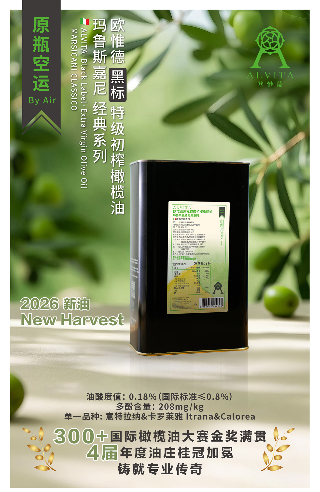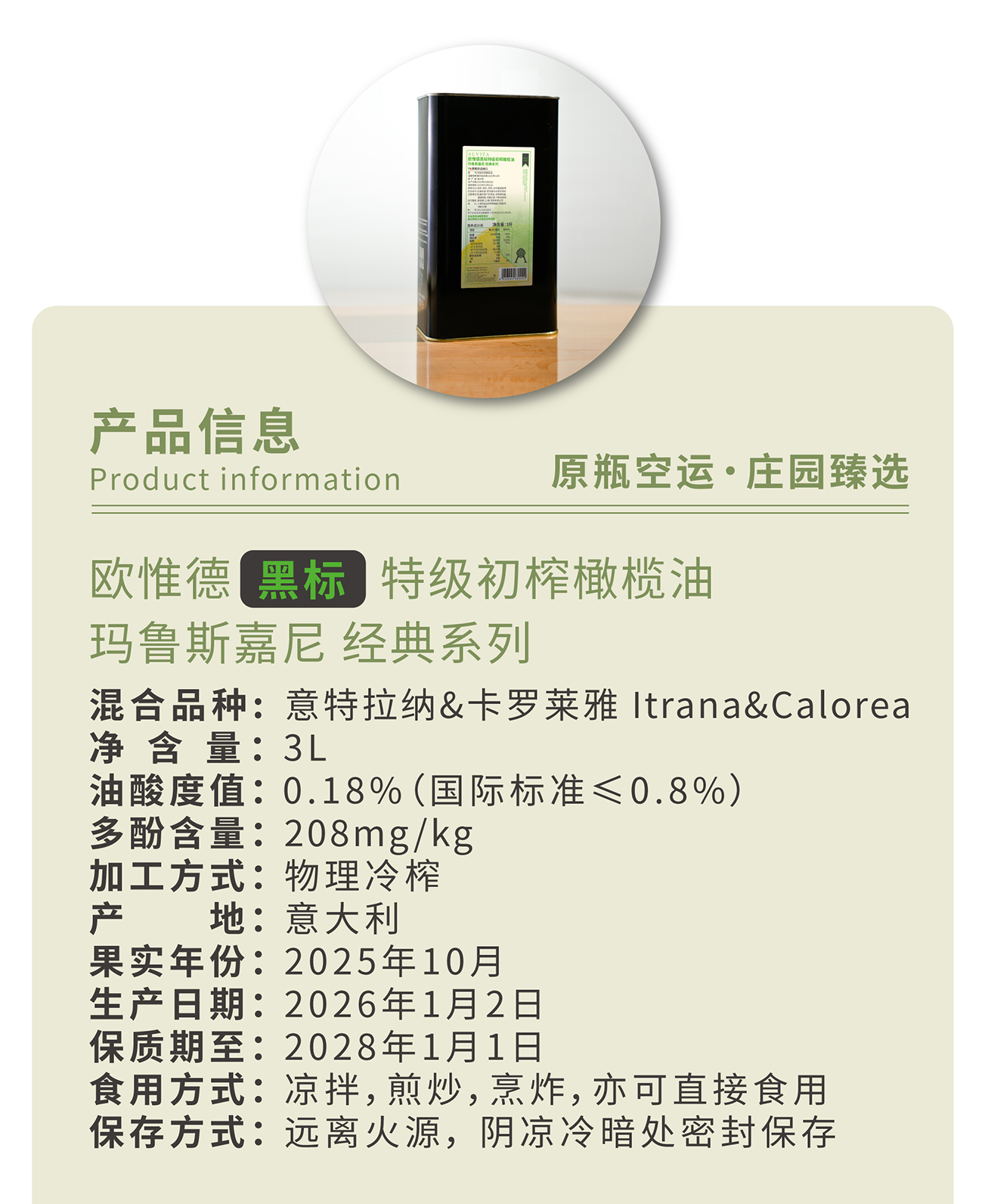 2026新油 玛鲁斯嘉尼油庄 黑标 特级初榨橄榄油3L装