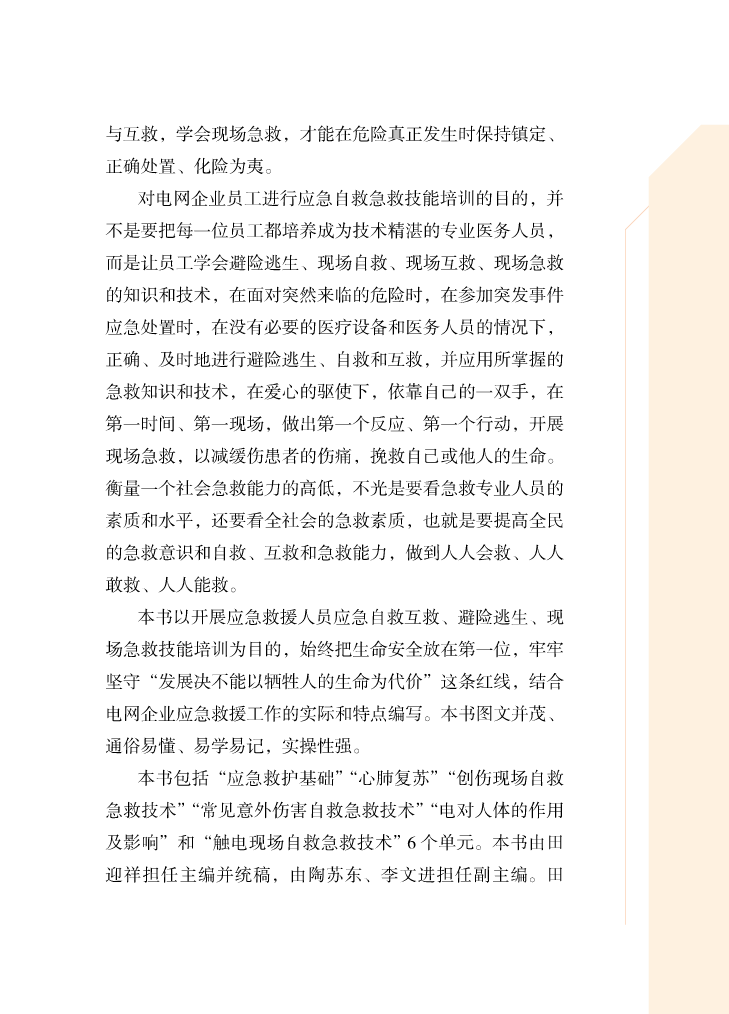 本书的编写人员及团队主要来自国网技术学院应急培训基地的资深培训师,具体扎实的专业理论知识和丰富的应急实践经验。同时,也得到了国网安监部应急处、国网山东电力、国网湖北电力、国网辽宁电力、国网河南电力,以及红十字会山东鲁南应急救护培训基地张科军博士及其团队等系统内外的大力支持和帮助。