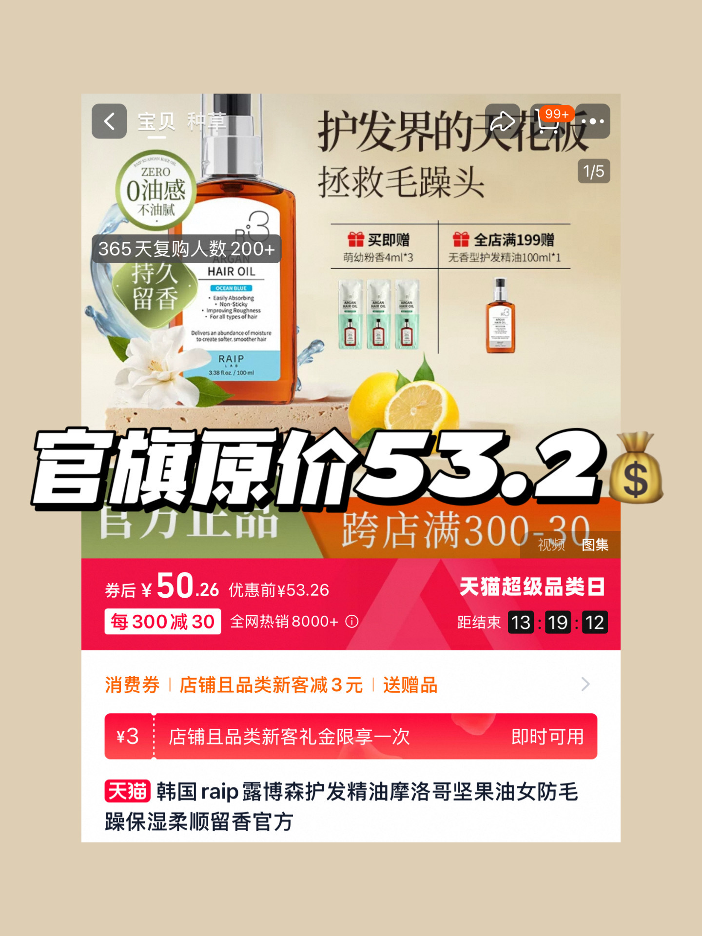 花30多得到300+的效果‼王一博无名同款《韩国Raip露博森 R3护发精油100ml》咱一瓶三十几💰官旗一瓶52💰‼
