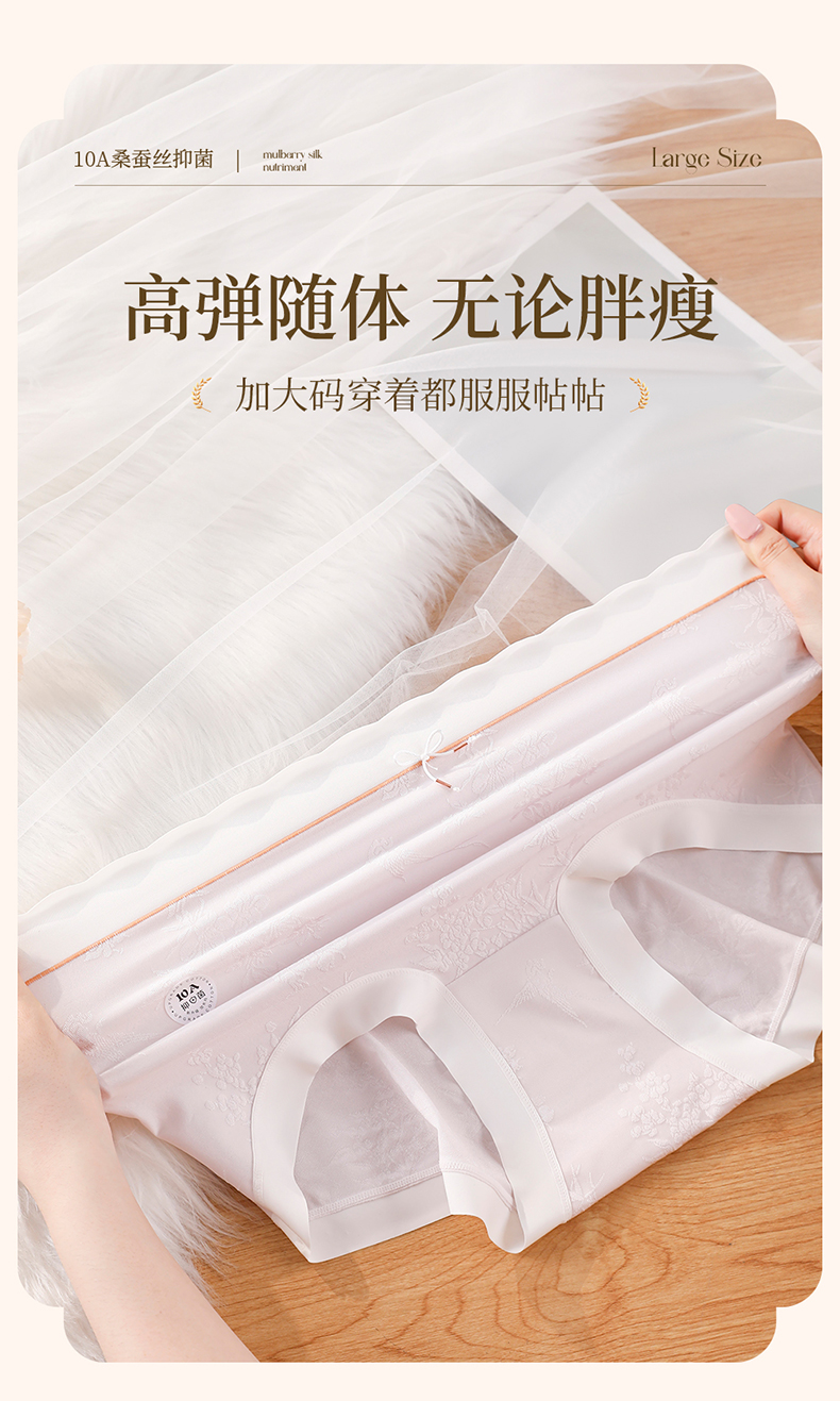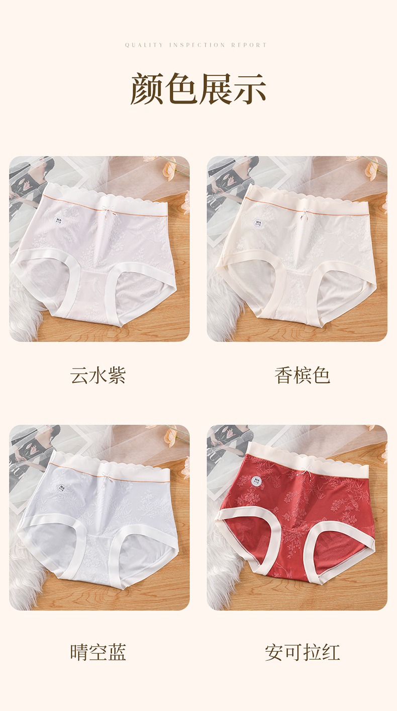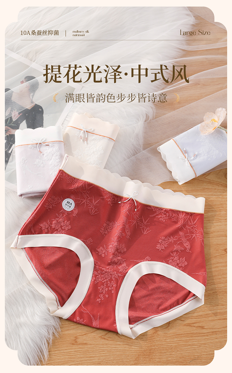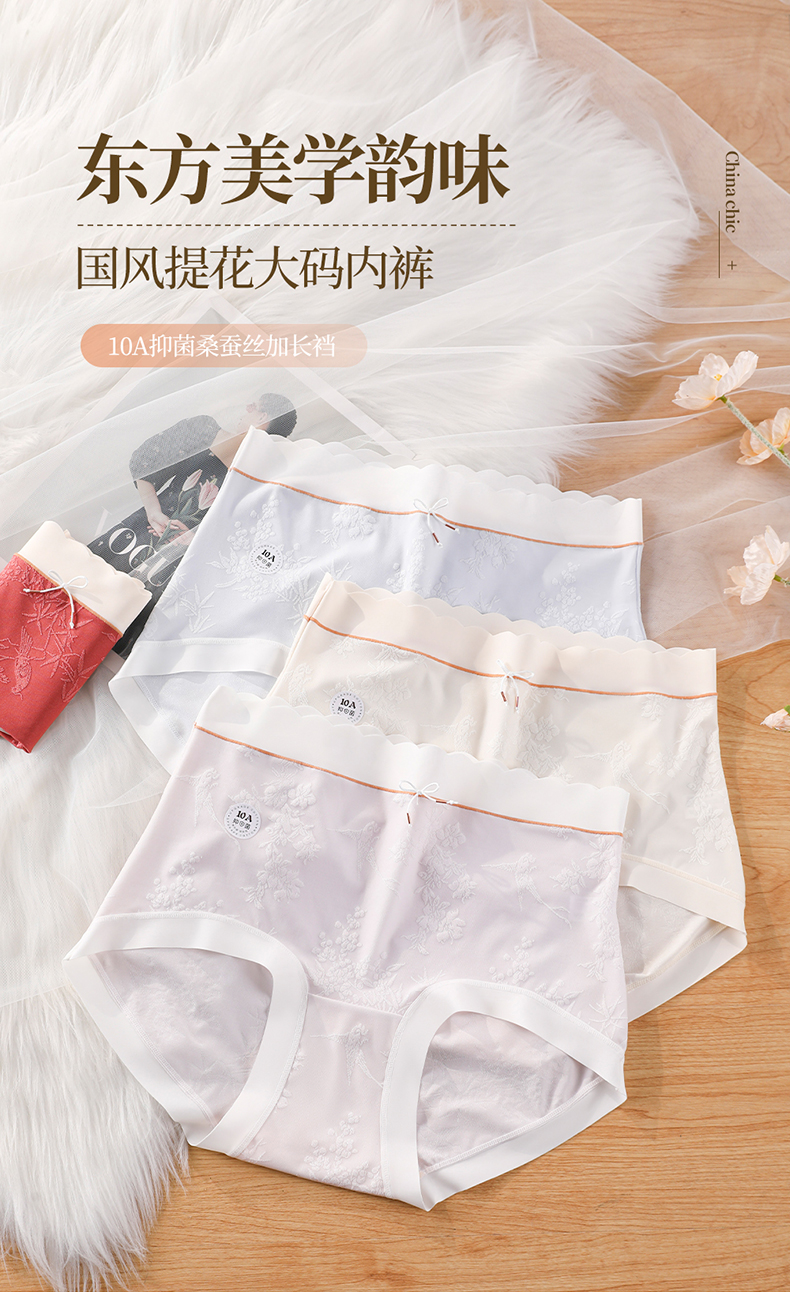 国风浮雕提花大码内裤女高腰收腹桑蚕丝加长裆冰丝内裤 398#