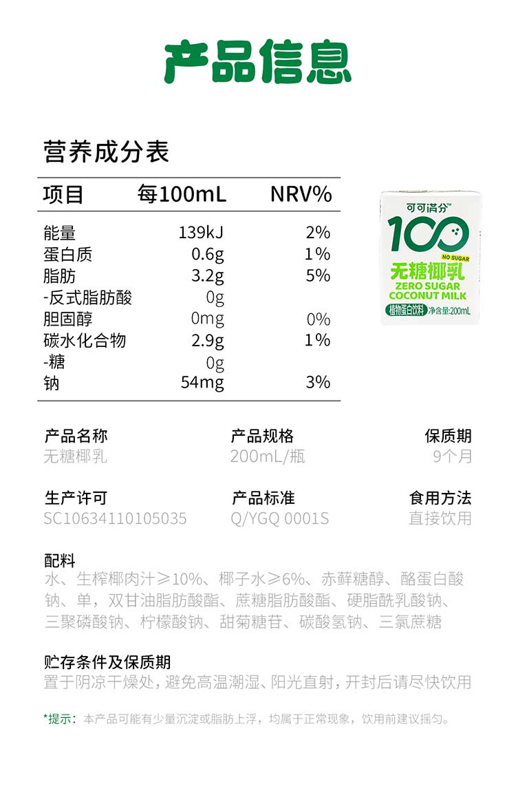 可可满分无糖椰乳200ml*8瓶