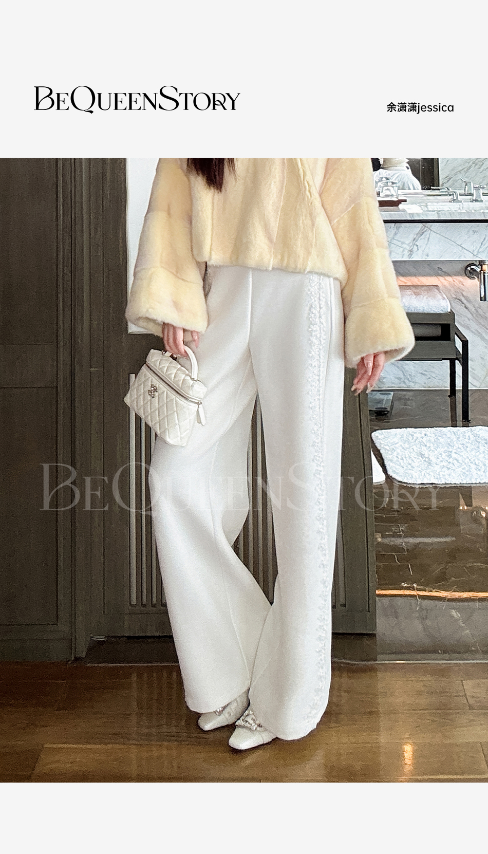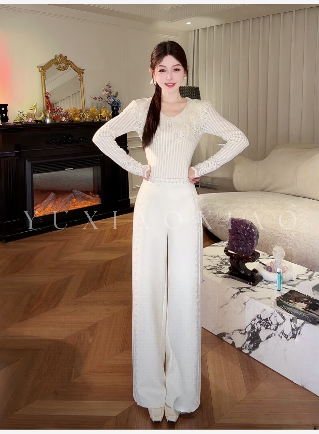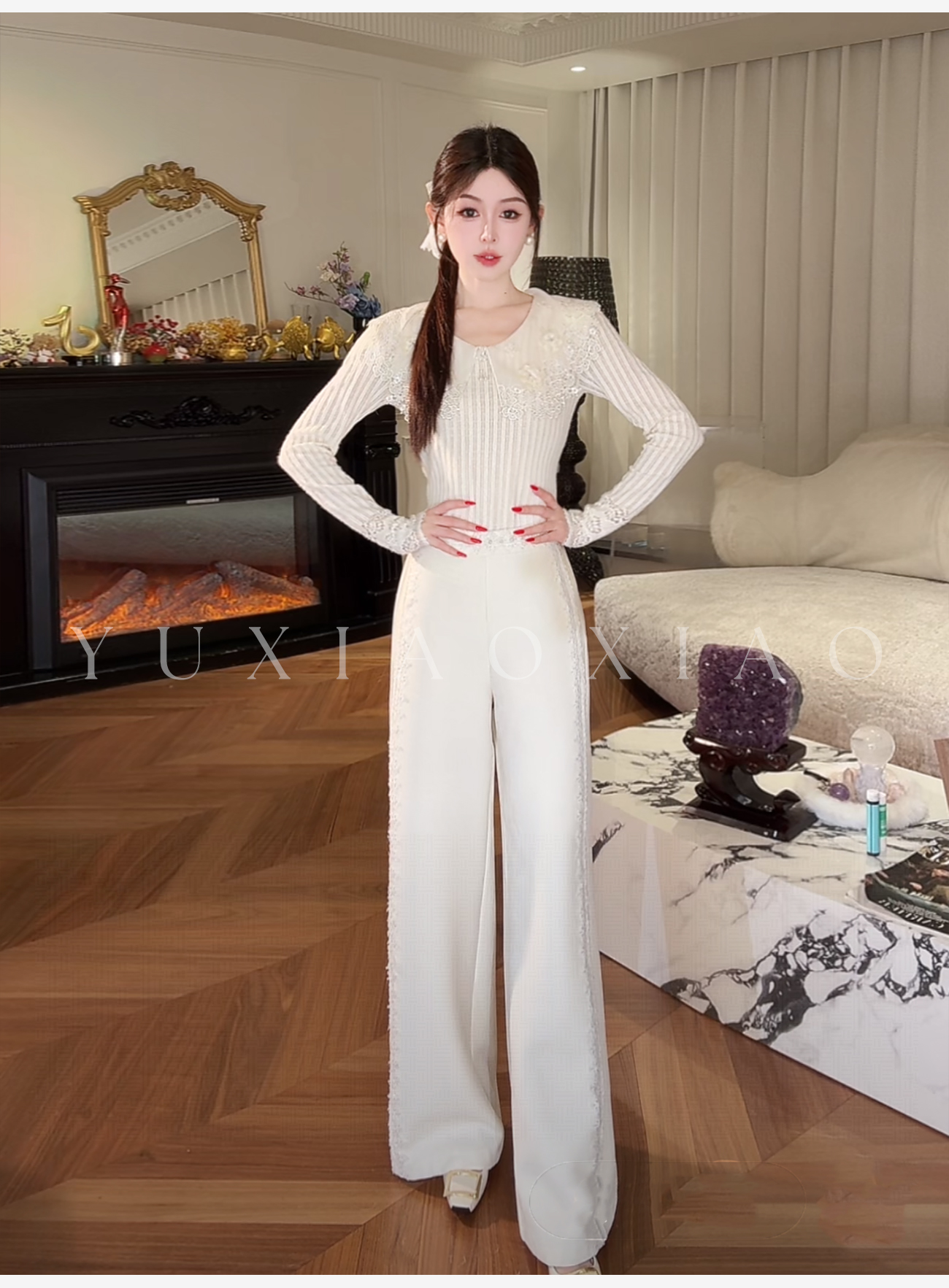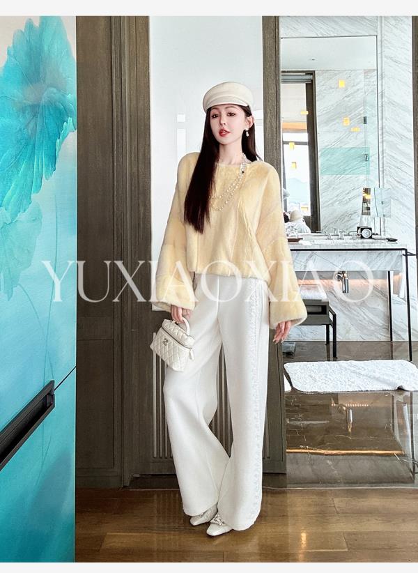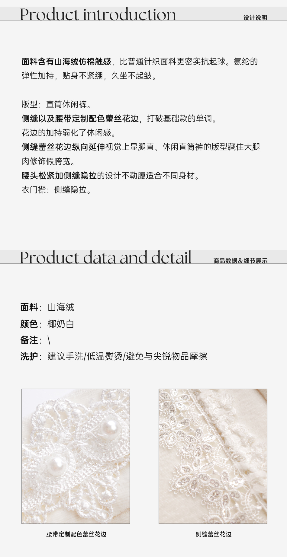 余潇潇【星光筑梦】时尚百搭山海绒混纺拼接蕾丝花边显瘦直筒休闲裤
