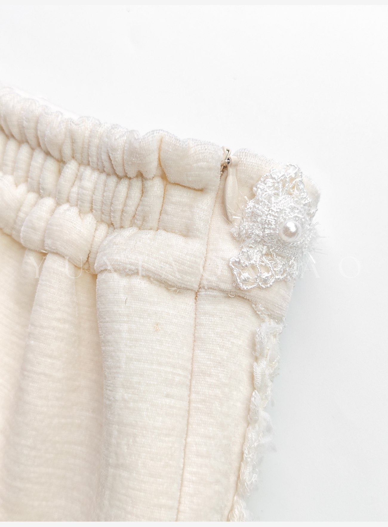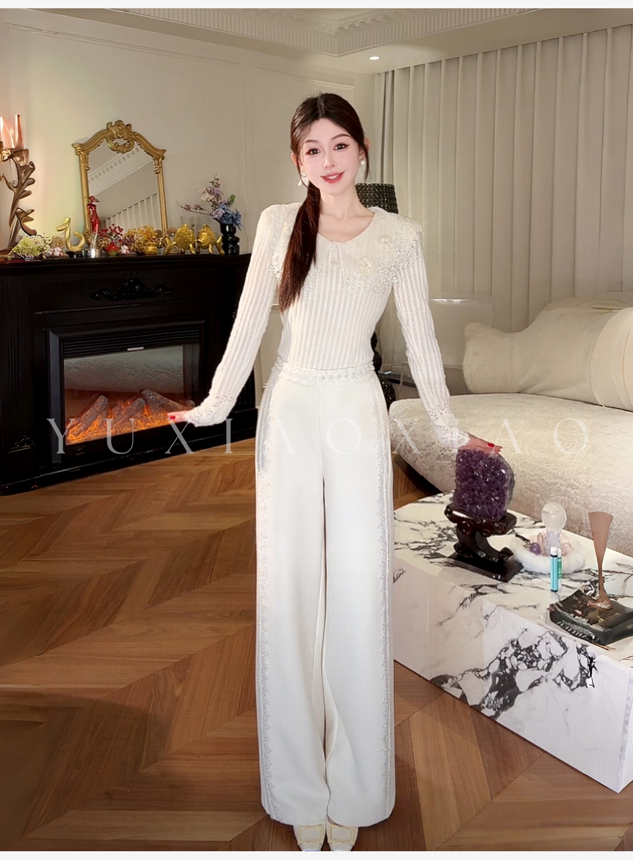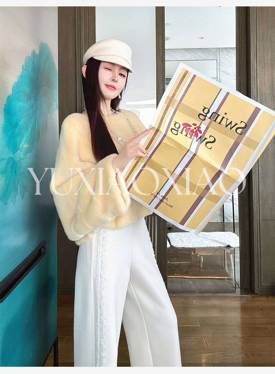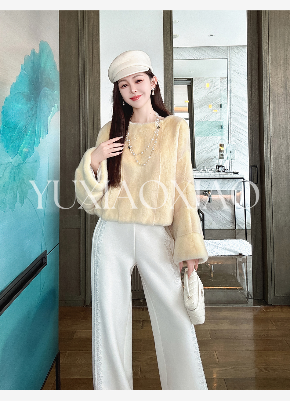 余潇潇【星光筑梦】时尚百搭山海绒混纺拼接蕾丝花边显瘦直筒休闲裤