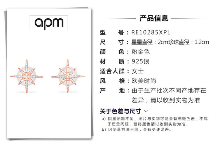【授权商品】APM MONACO 女士粉金色纯银镶晶钻流星珍珠耳钉 RE10285XPL
