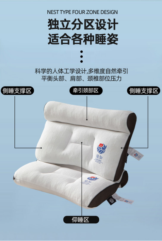 ✅人体工程学五分区设计,打破传统一体枕局限! 分为侧睡区,仰睡区,脖颈区,每一个分区独立填充,立体不坍塌。 能满足多种睡姿,肩颈兼顾,翻身不落枕,很好的缓解压力,彻底感受全身放松的睡眠。