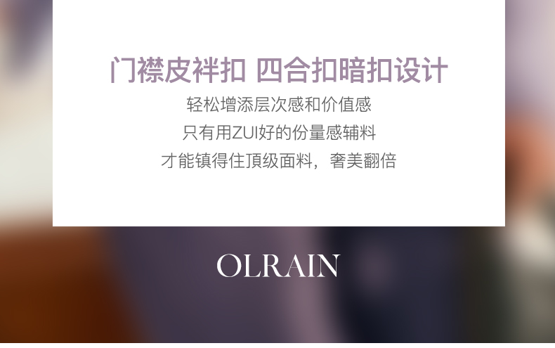 - “精致”是欧芮儿olrain品牌文化的核心,欧芮儿认为,精致的女人,不但要外在动人,更要内在迷人,内外兼修,有魅力、有气质、有内涵,自信而不自傲,优雅而不矫揉,自有万种风情而不轻浮,更不故作矜持。