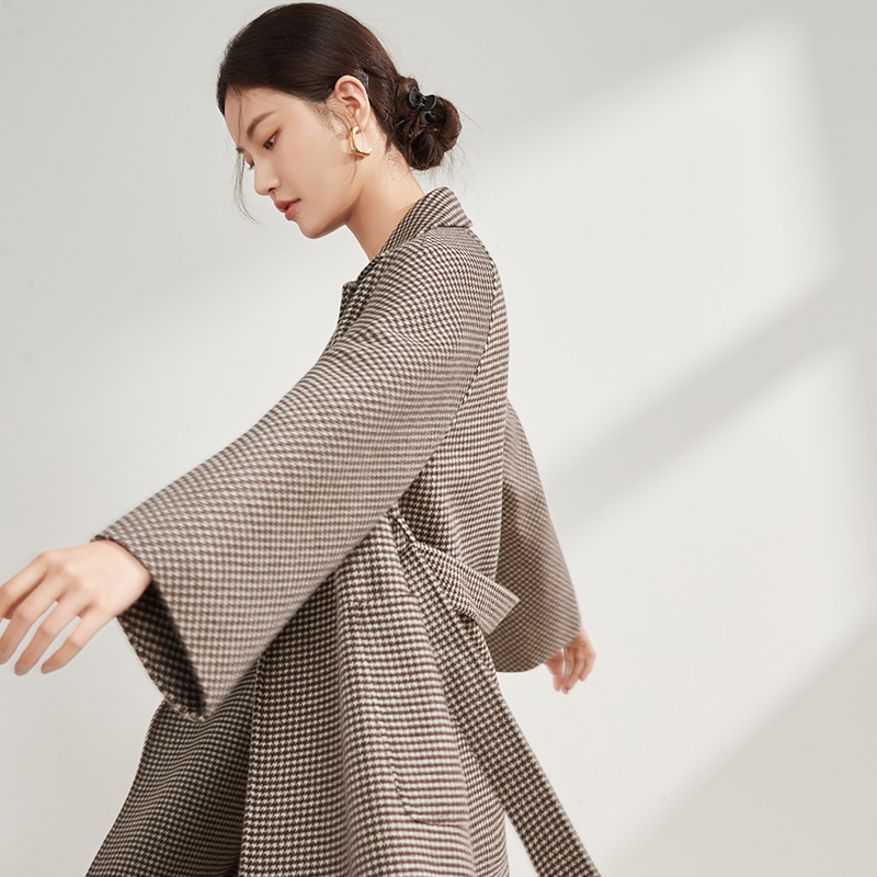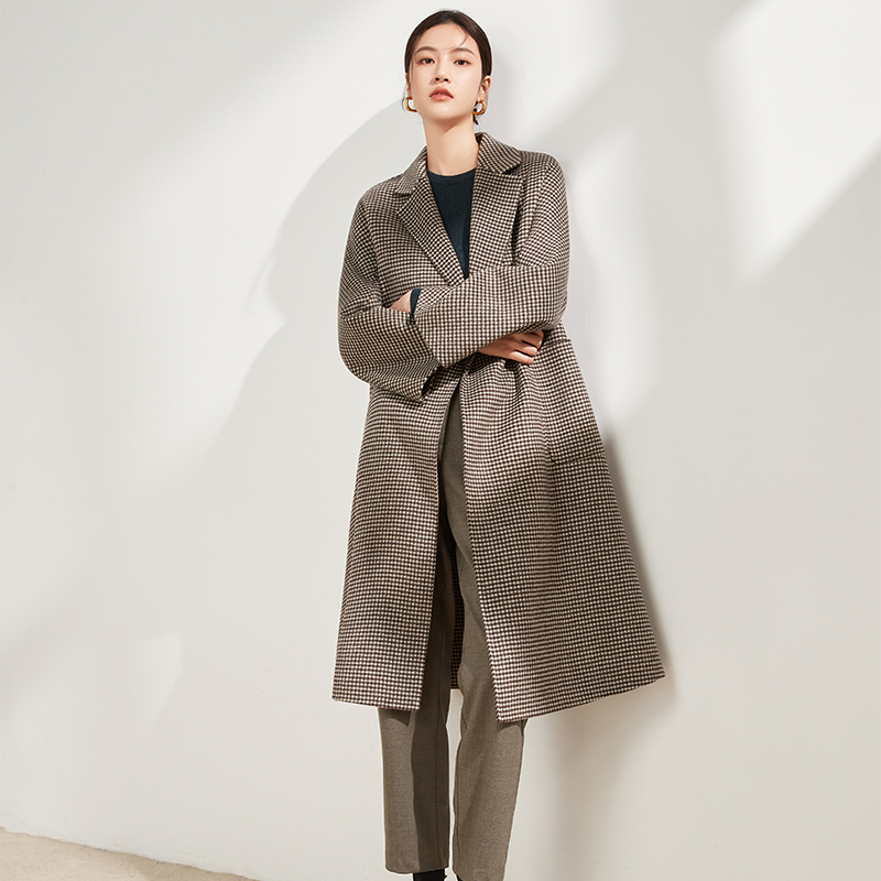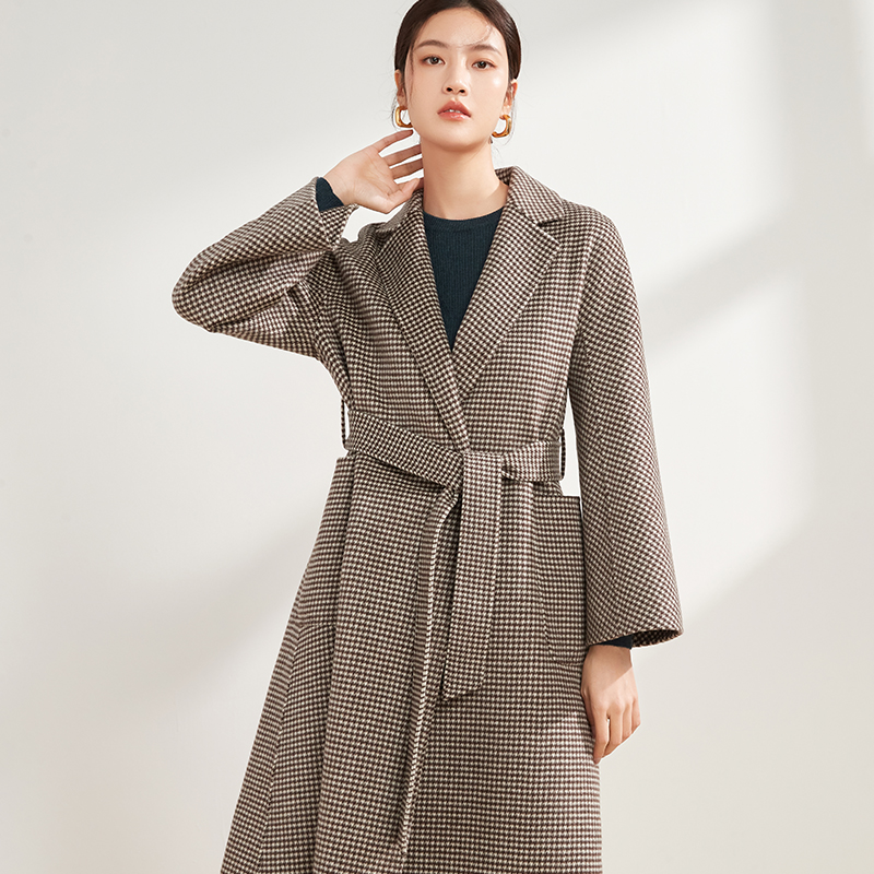 【经典千鸟格羊毛大衣】秋冬新品女士中长款羊毛大衣经纬咖啡各位毛呢外套