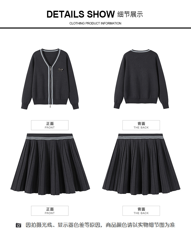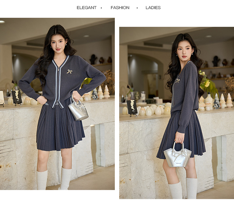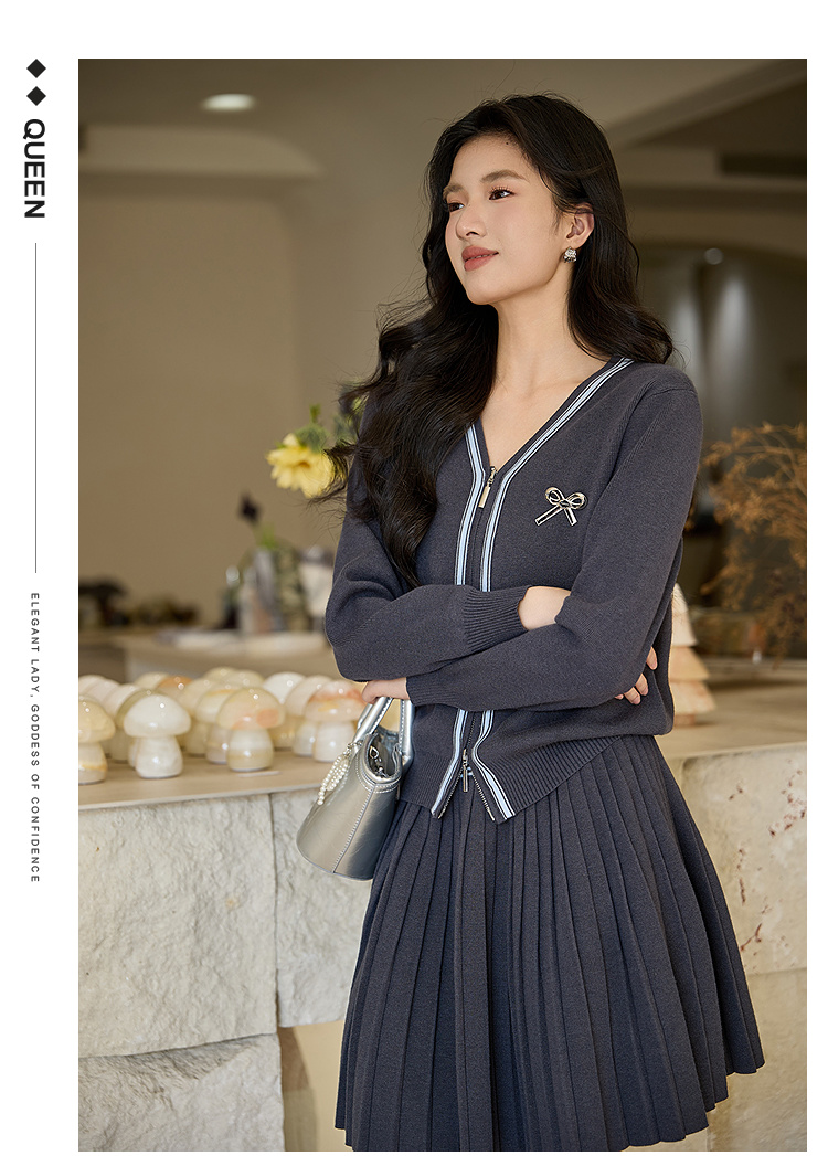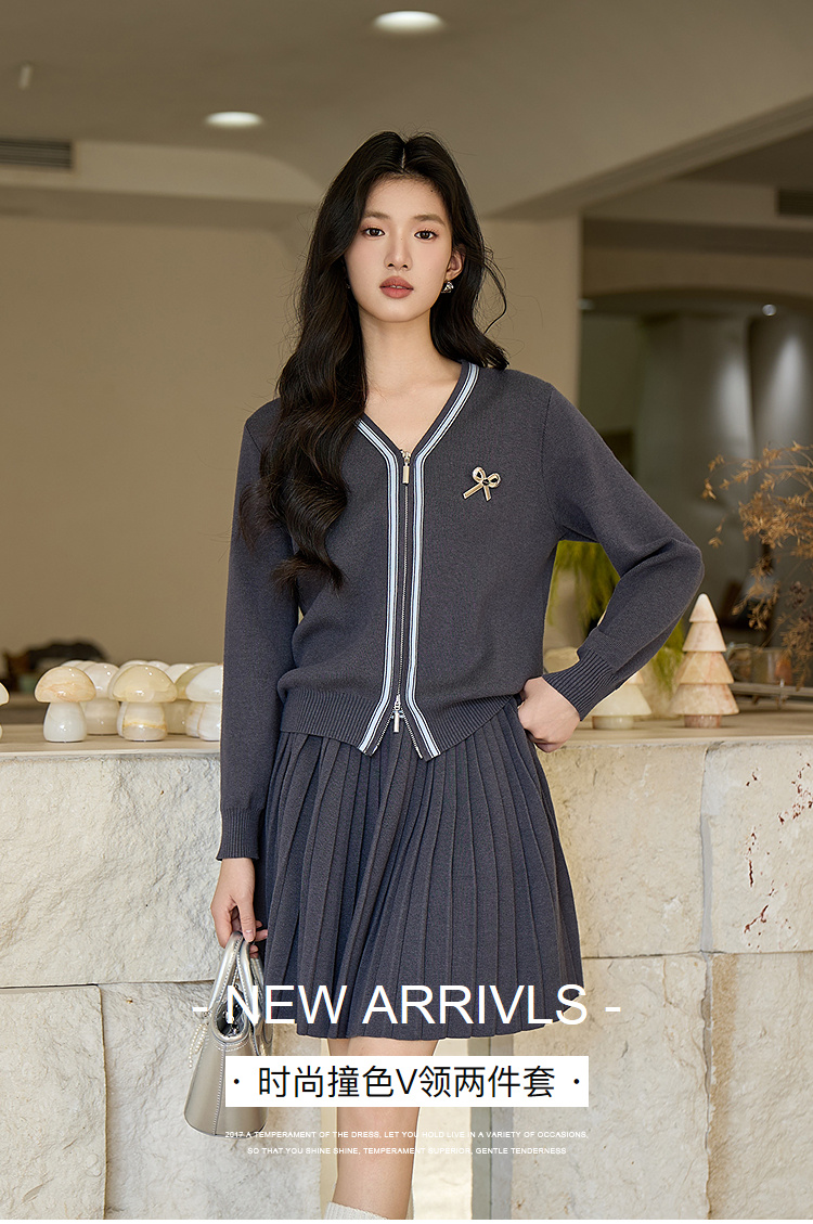奢姿大码女装2025冬季胖妹妹时尚撞色拉链针织开衫百褶裙两件套装