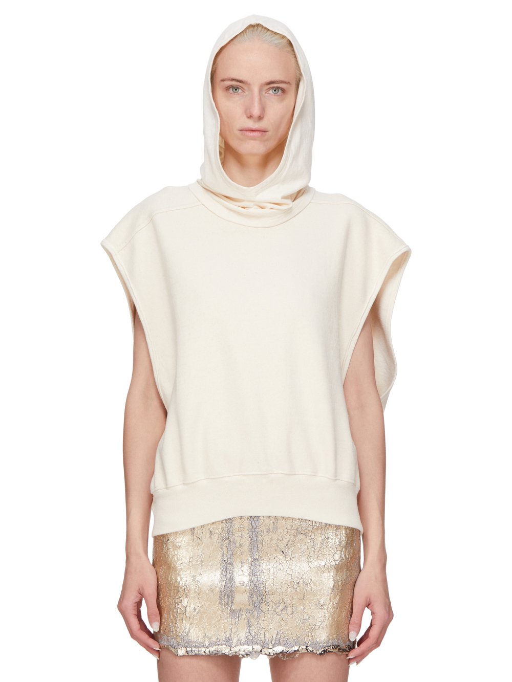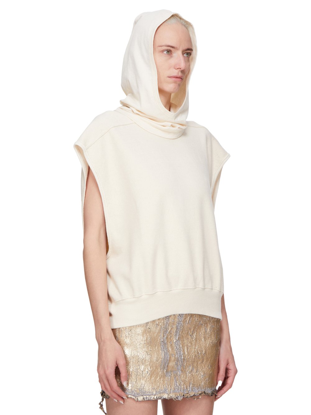 这款优雅风帽宽松地套在头上,宽椭圆形的帽檐勾勒出脸部轮廓,垂落下来遮盖住颈部。