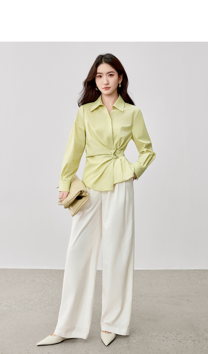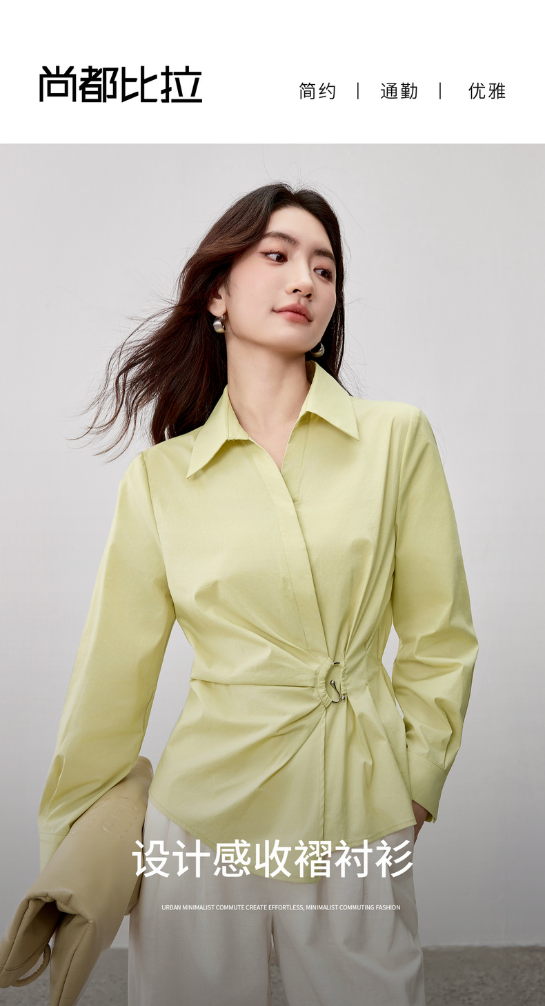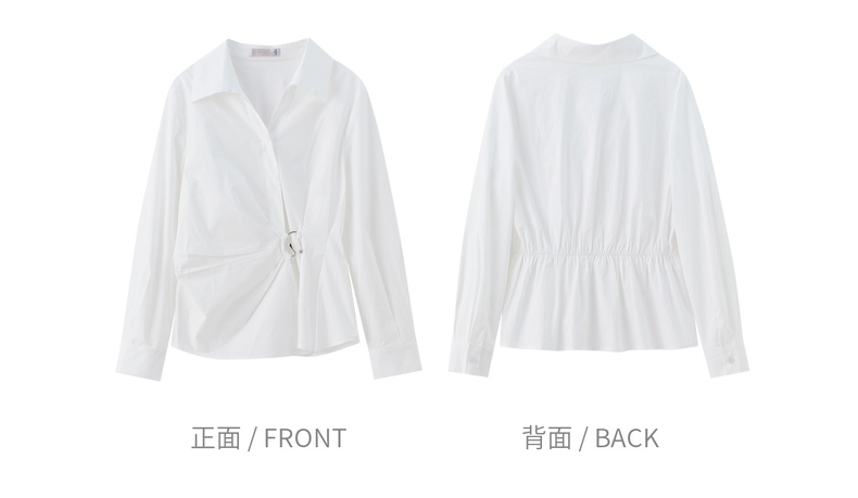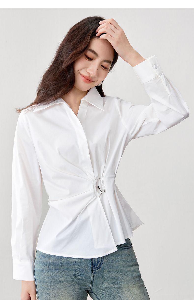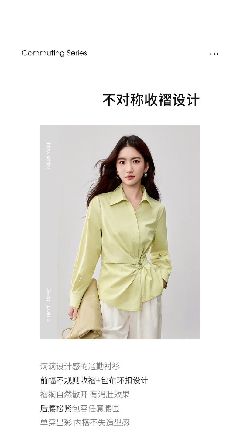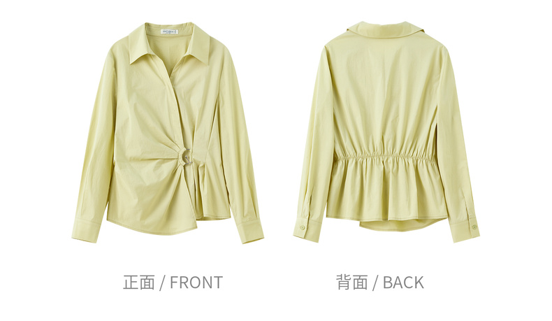 【内购】【收腰显瘦】通勤设计感翻领不对称收褶环扣设计后腰松紧长袖衬衫-W53CA2861